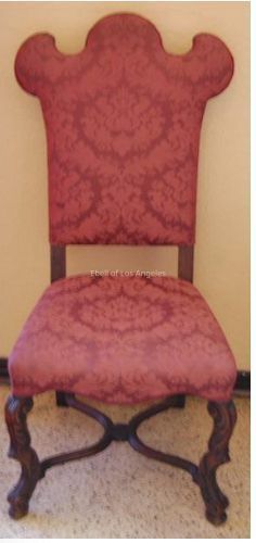 Set of eight Flemish Baroque style carved beech wood side chairs with dark wood cabriole legs connected by two curved stretchers. The top of the back is curved in an exaggerated scallop. The upholstery is red silk.Collection