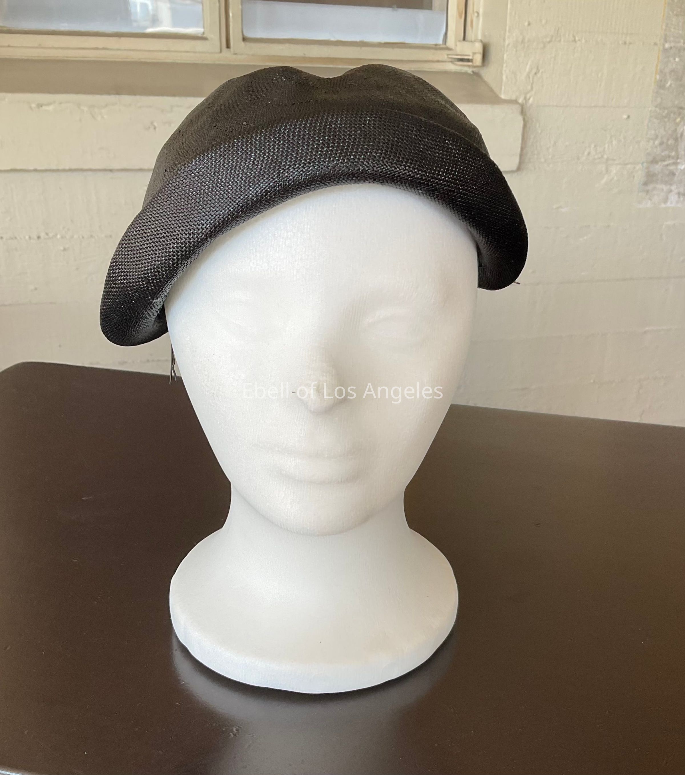 Black straw close fitting half hat with small brim and black velvet trimCollection