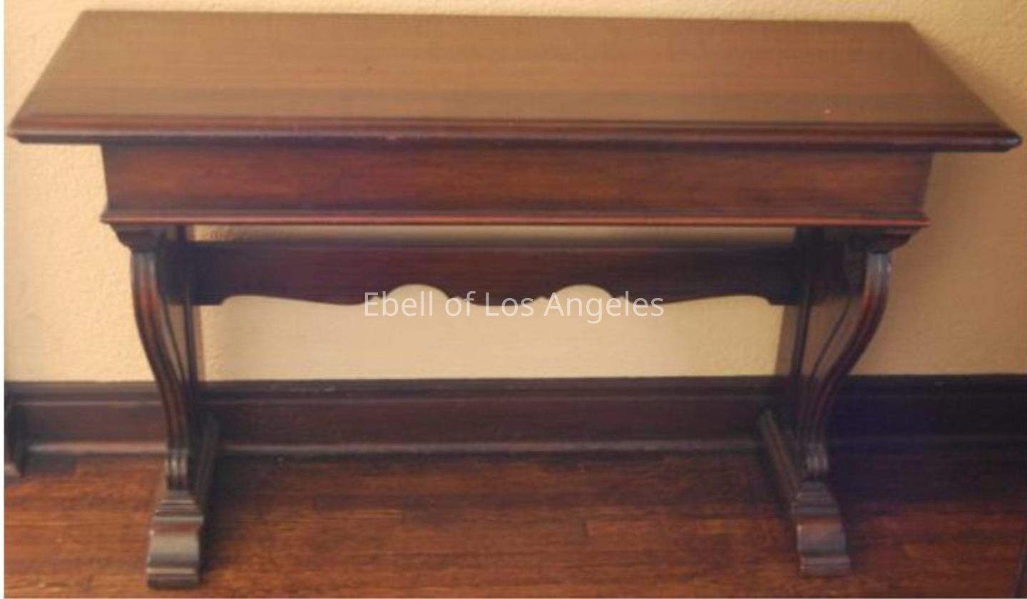 Pair of Renaissance style oak console tables with plain apron, scalloped accent piece and lyre shaped side legs.Collection
