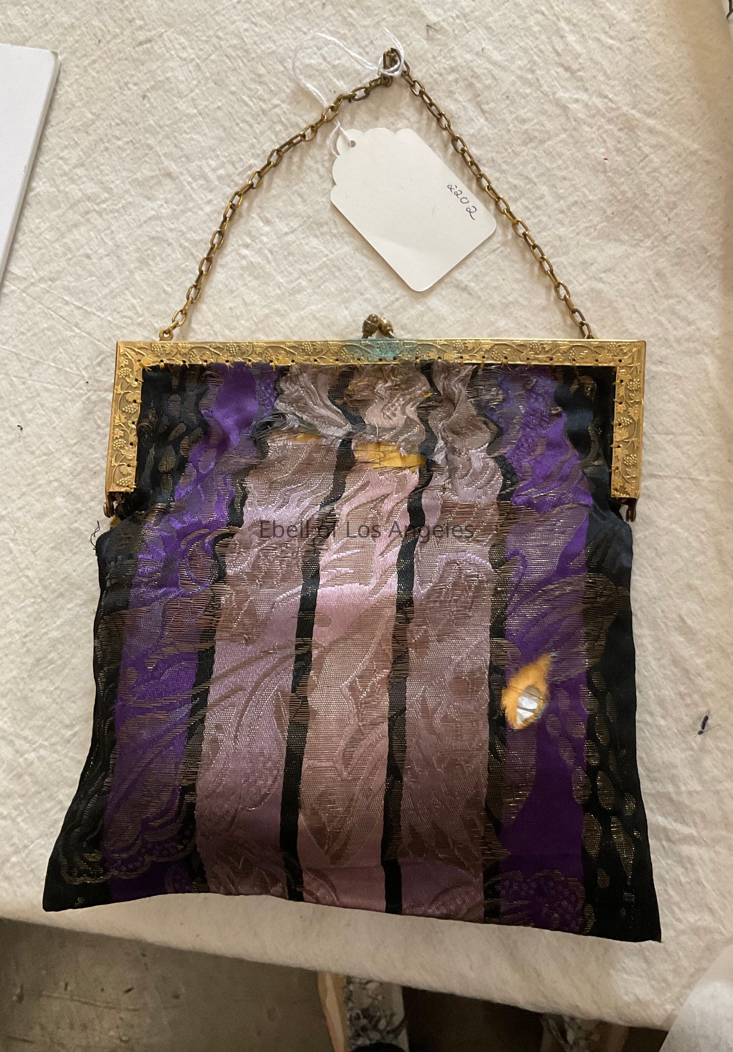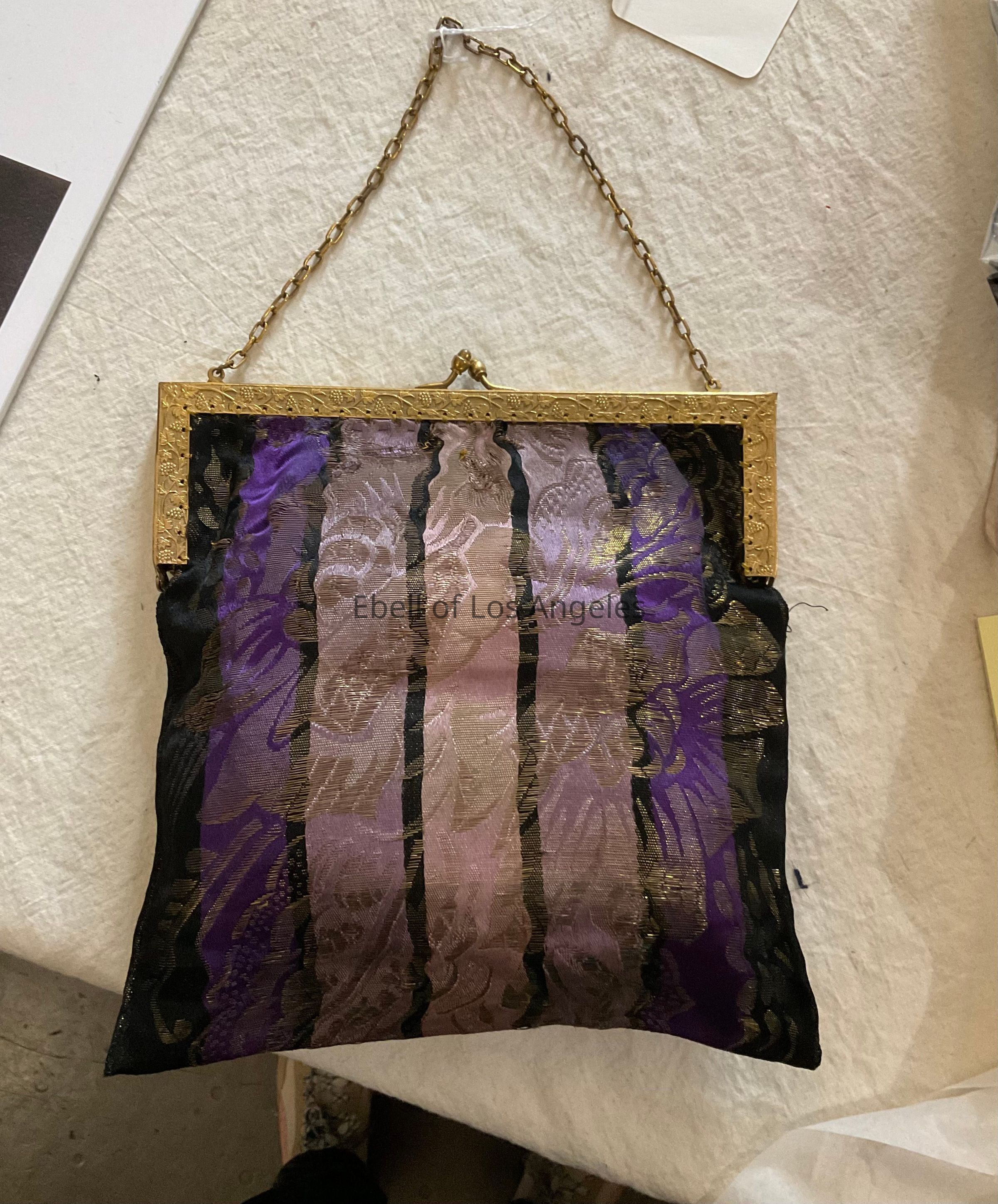 Silk with gold thread filament damask purse, gold kissing lock frame with grape motif & rosette trim interiorCollection