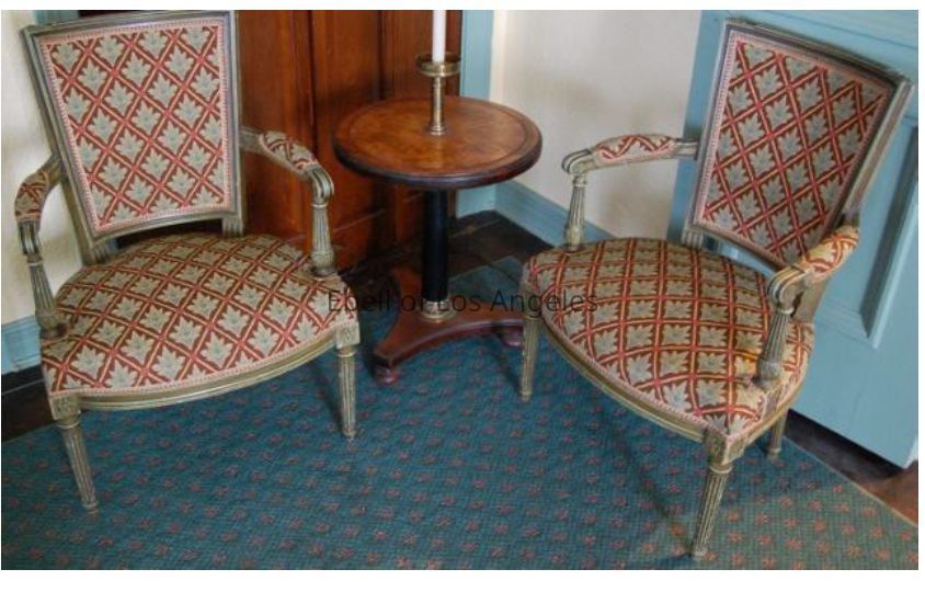 Pair of Louis XVI style green painted fauteuil with rolled and fluted arms, rosette accents and tapered and fluted legs. The fitted style upholstery is welted and displays a green and red leaf pattern.Collection