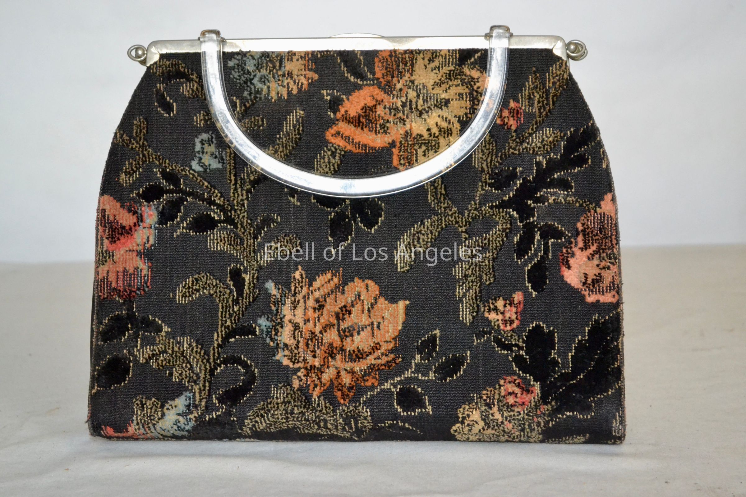 Tapestry purse with clear lucite handle, silver detailing, black fabric lining, zipper pocketCollection
