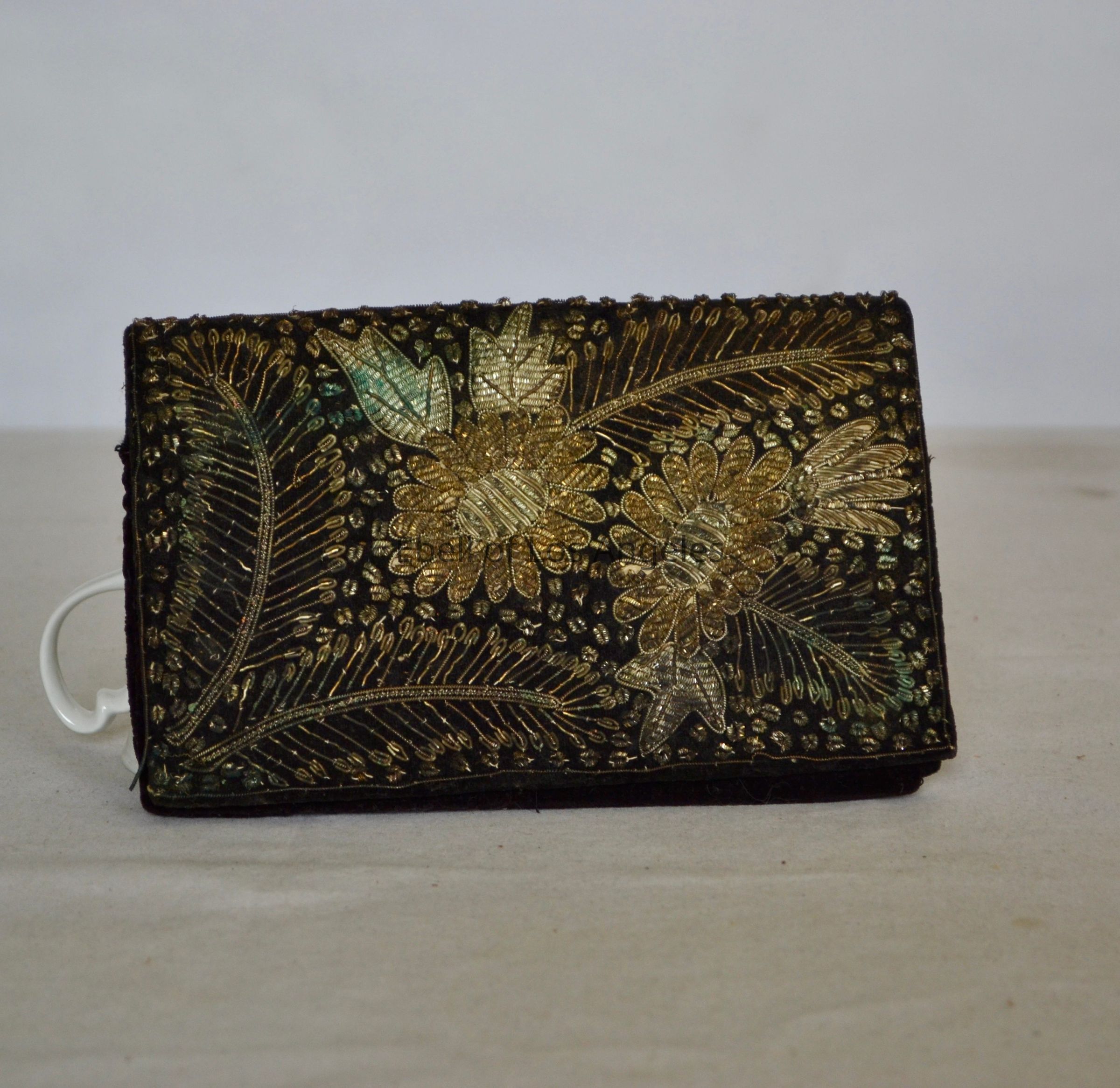 Beaded and embroidered velvet evening clutch, detailing on flap, envelope style clutch, back strap for hand holding, floral leaf motifsCollection