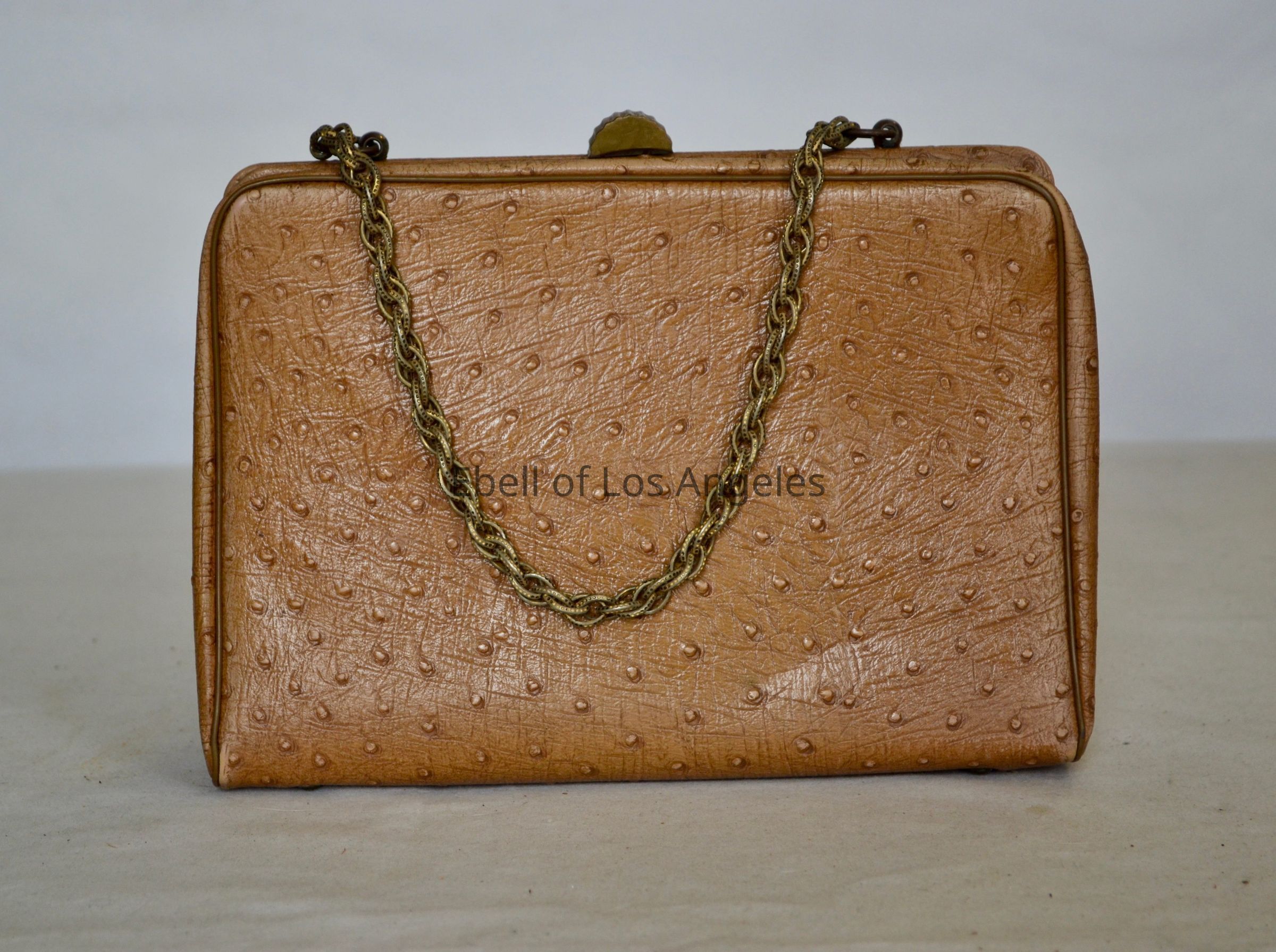 Embossed vinyl bag in ostrich pattern, gold tone hardware and chain strap