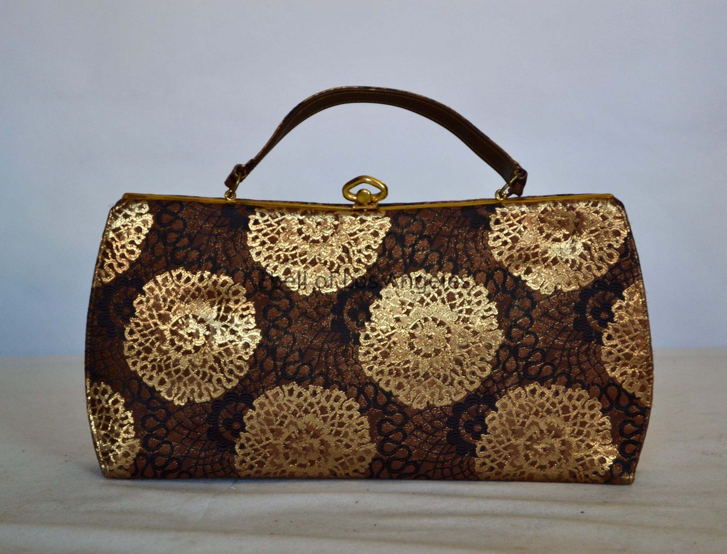 Rectangular brocade evening bag, gold frame, gold clasp, self handle