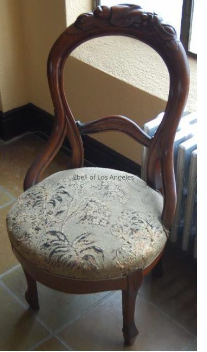 Victorian hand carved balloon back chair with fitted upholstered seat and open back. The top of the frame has leaf carving and the frame is curved overall. There are three of these chairs.Collection