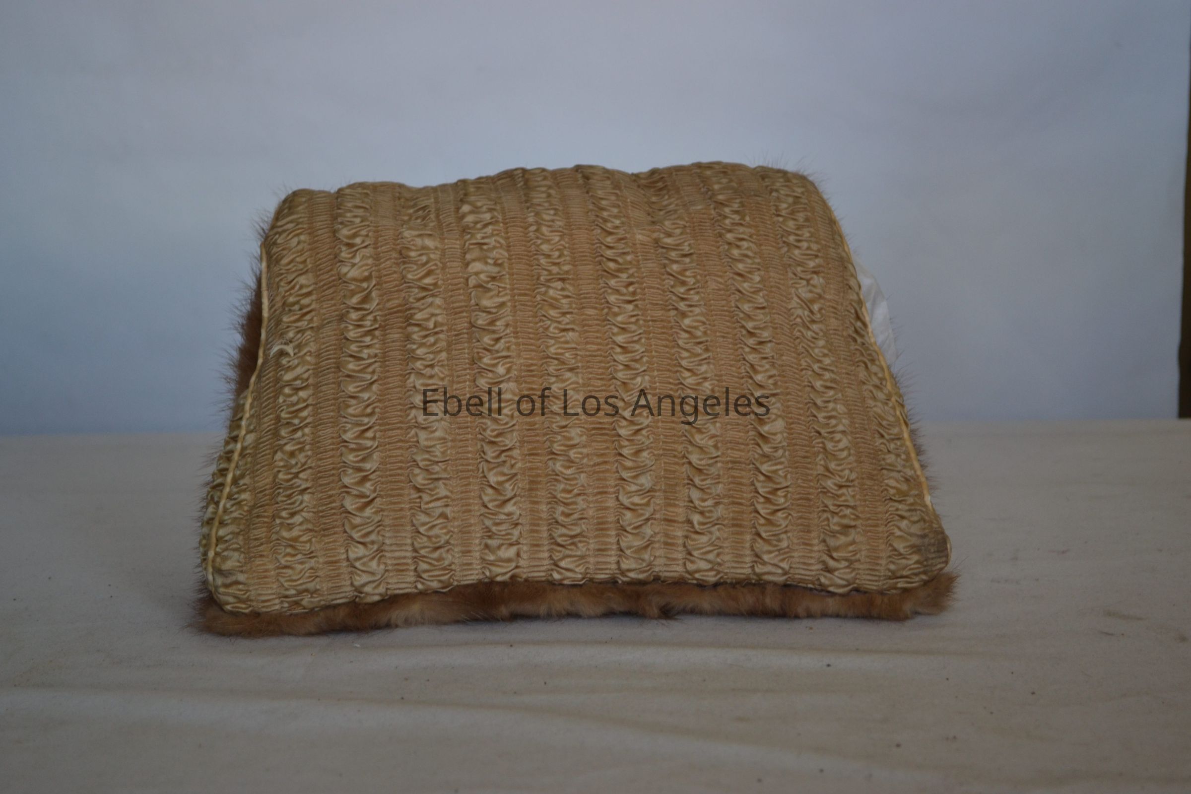 Mink muff bag, smocked silk, brown plastic handle