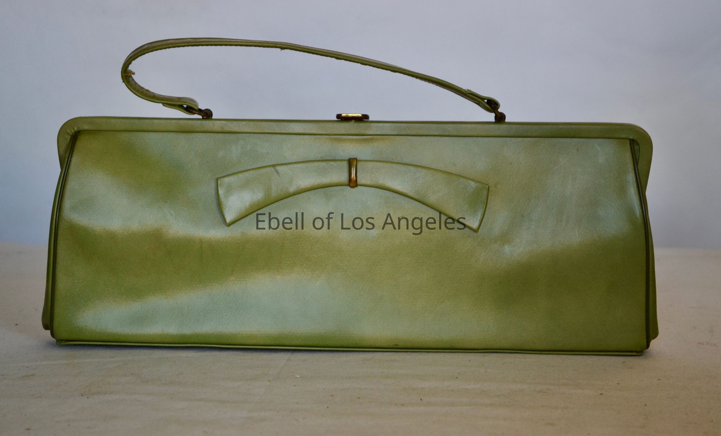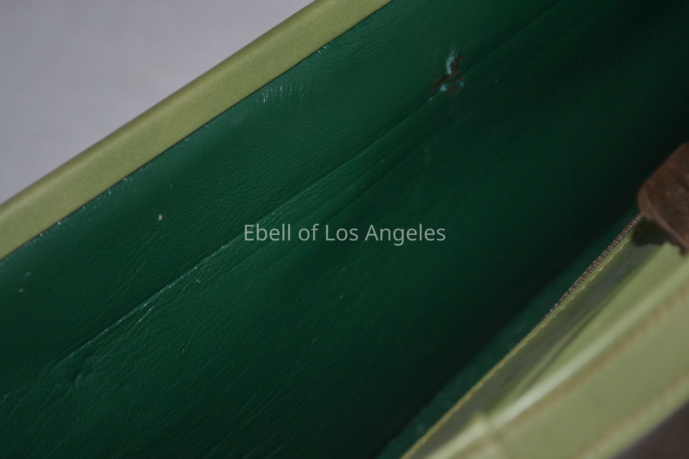 Leather long rectangular bag with self framed handle, contrast green leather lining , gold colored hardware, strapCollection