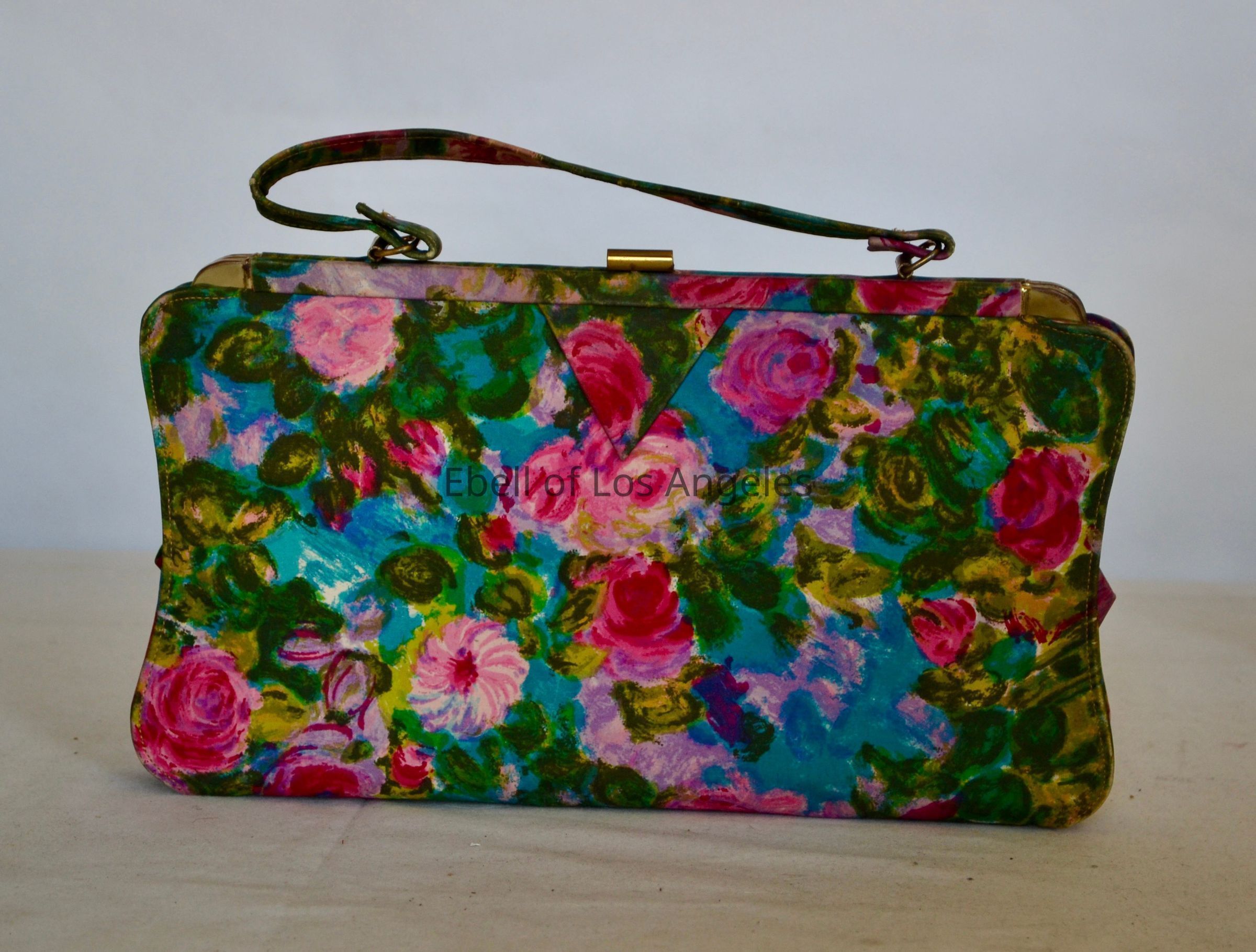 Floral fabric bag with gold frame, self handle, impressionist