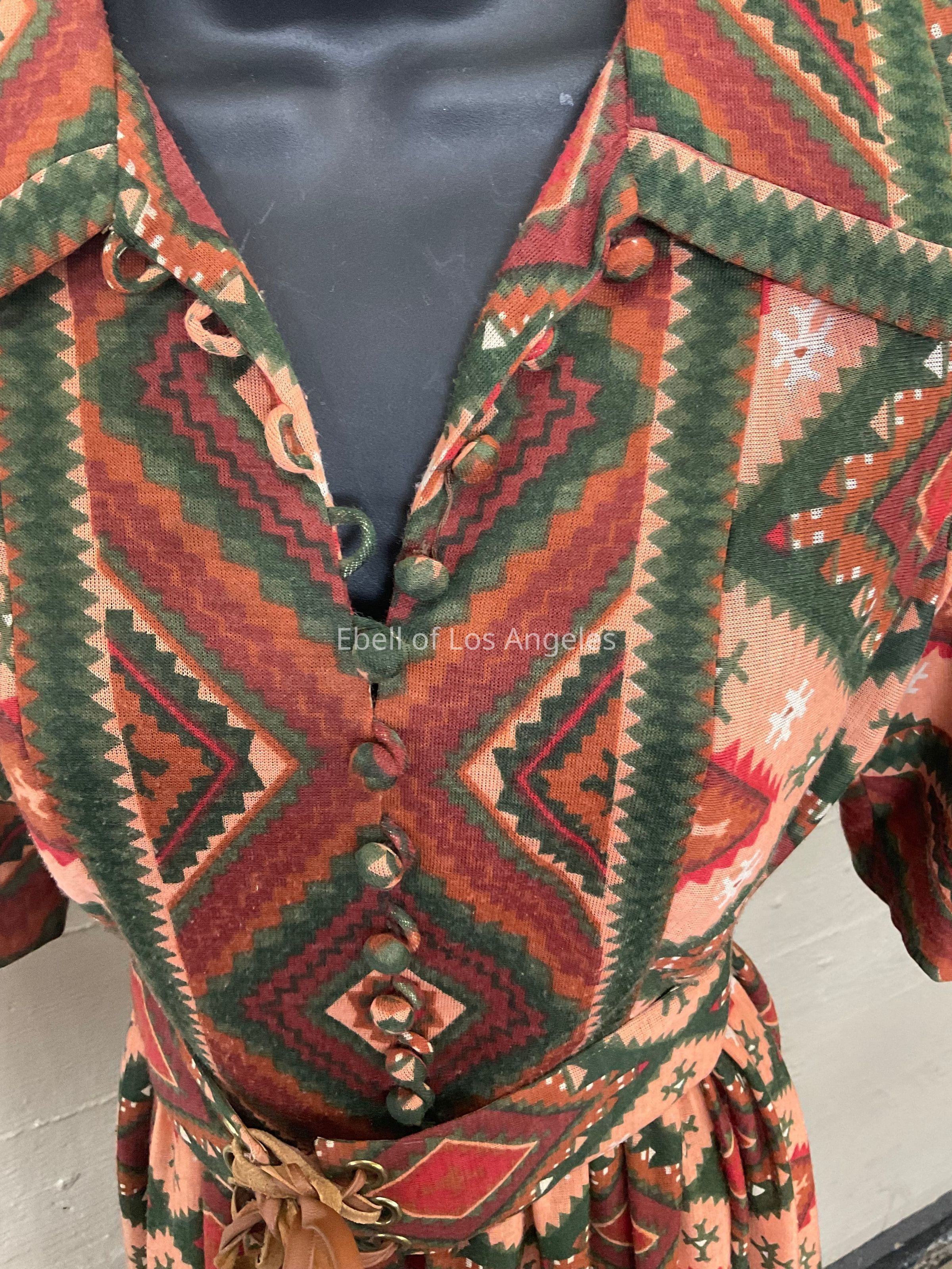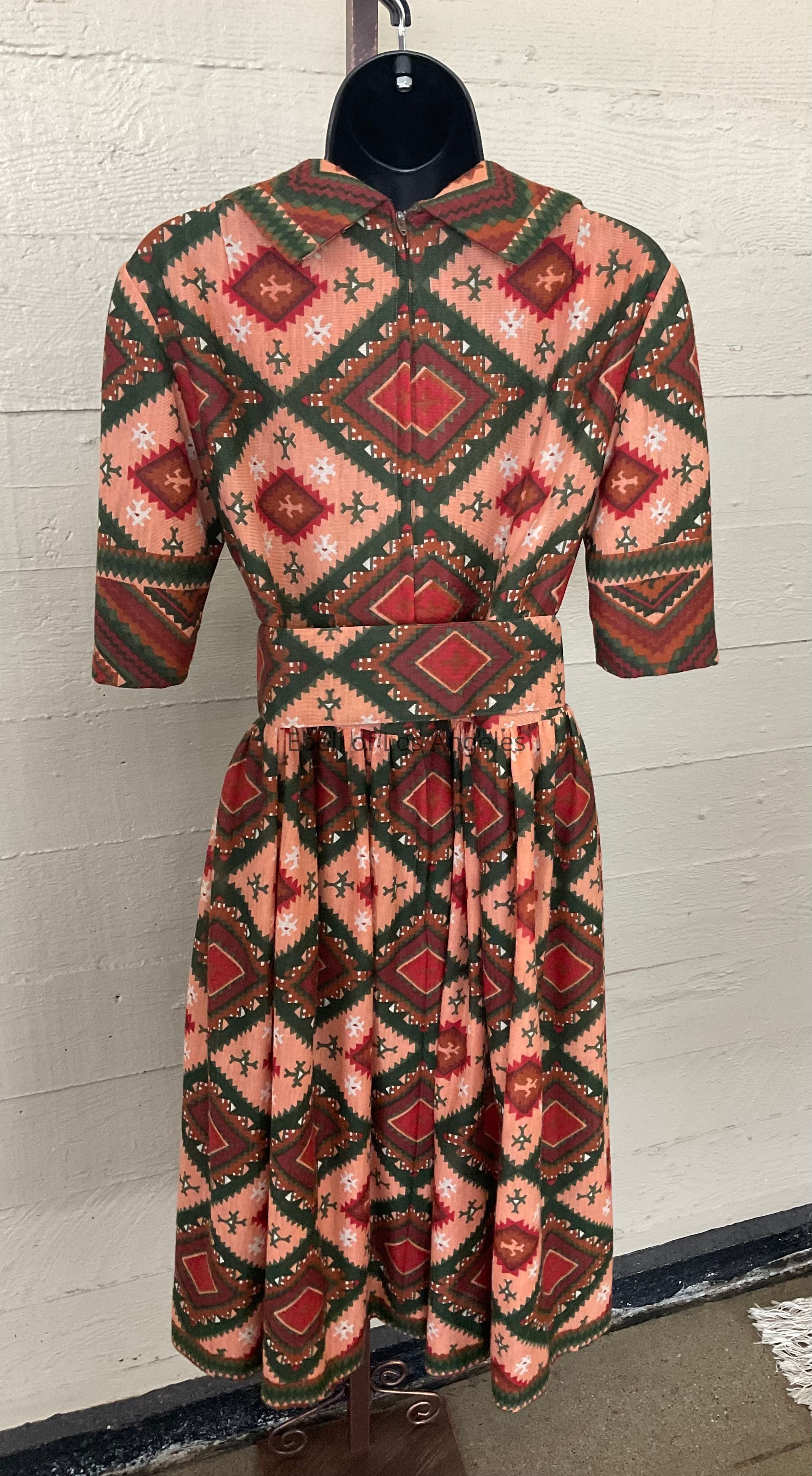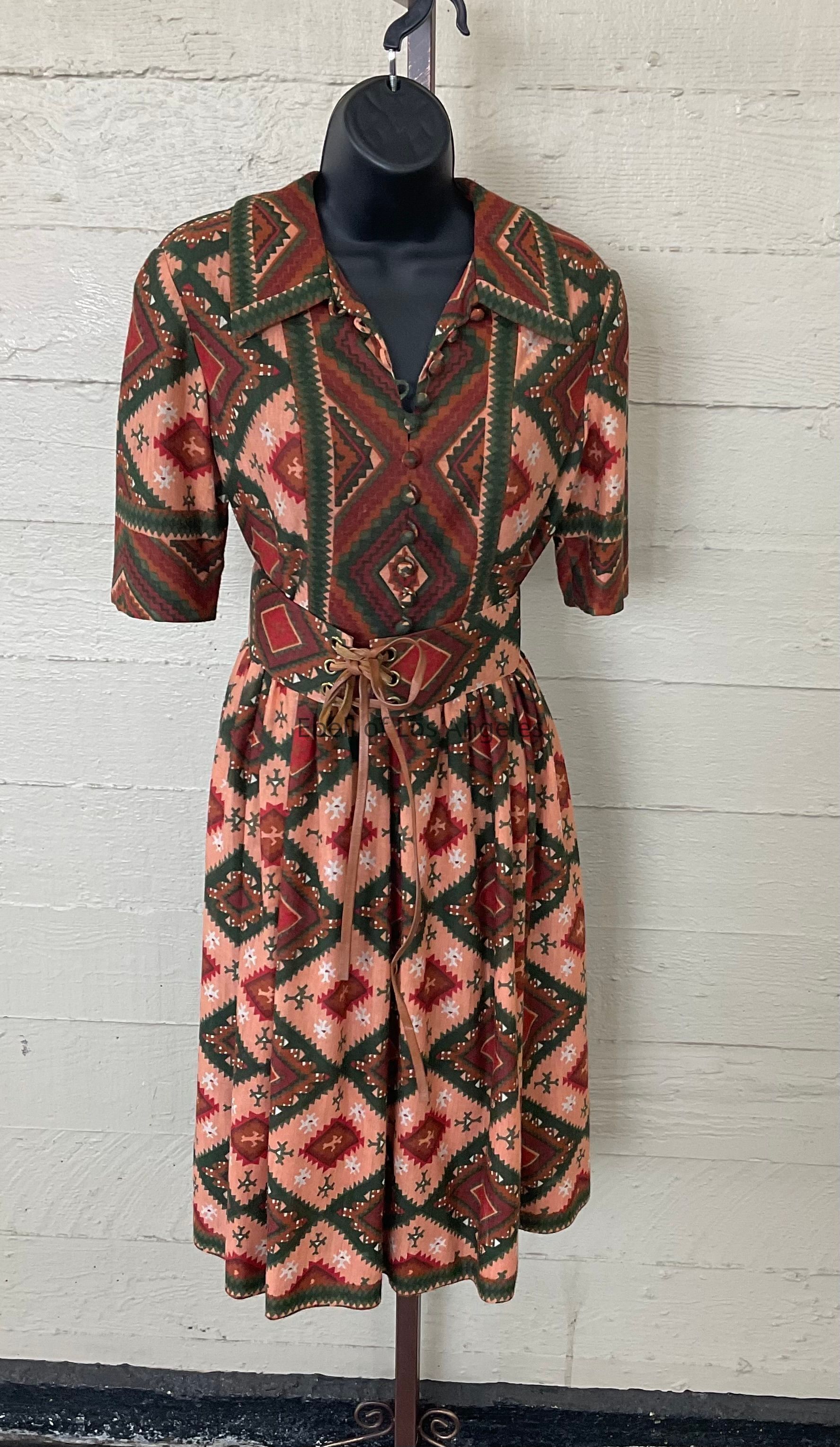 Tricot knit printed shirtwaist dress with self beltEntry/Object ID