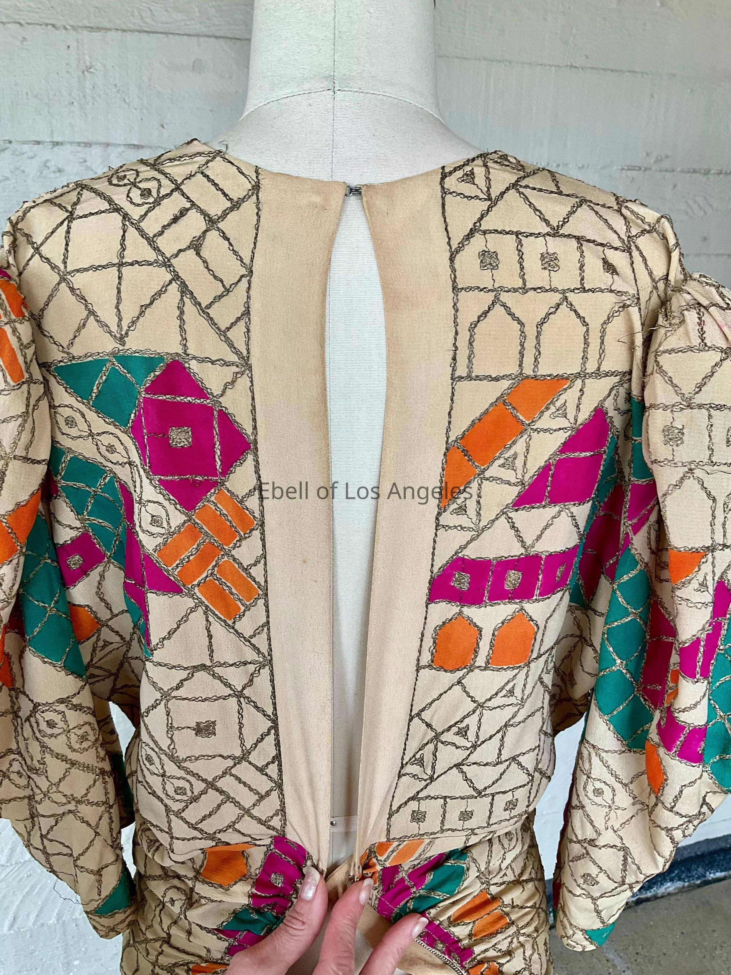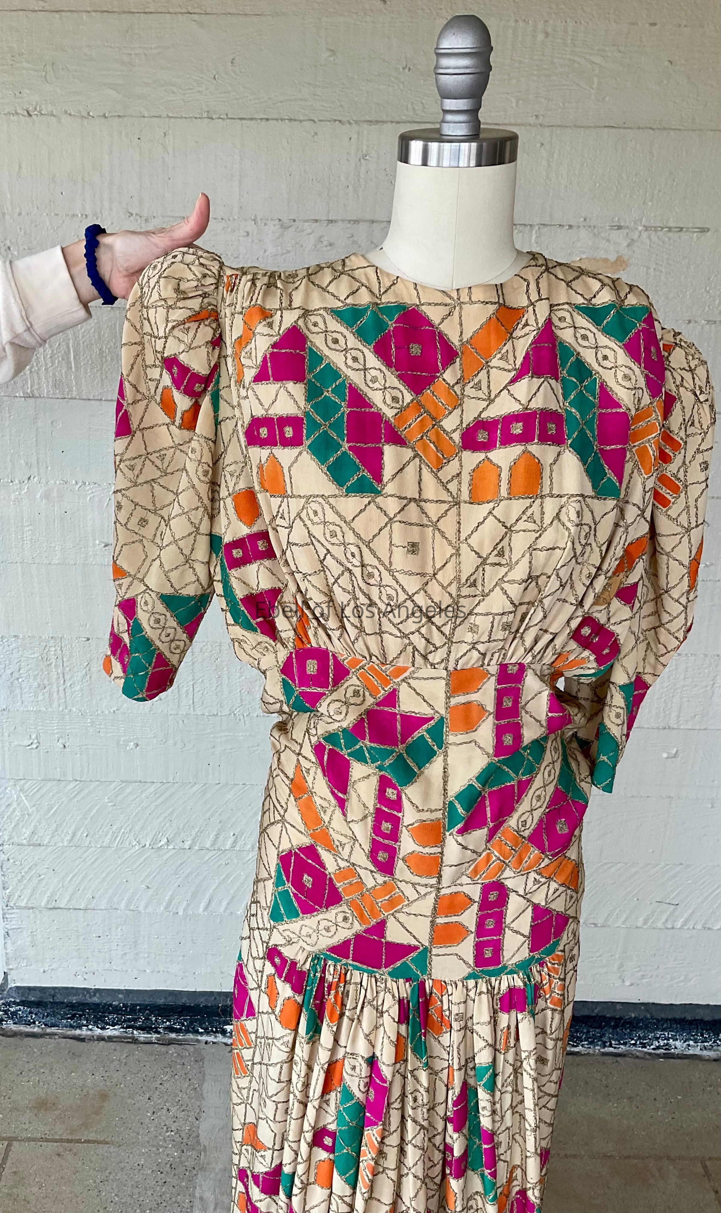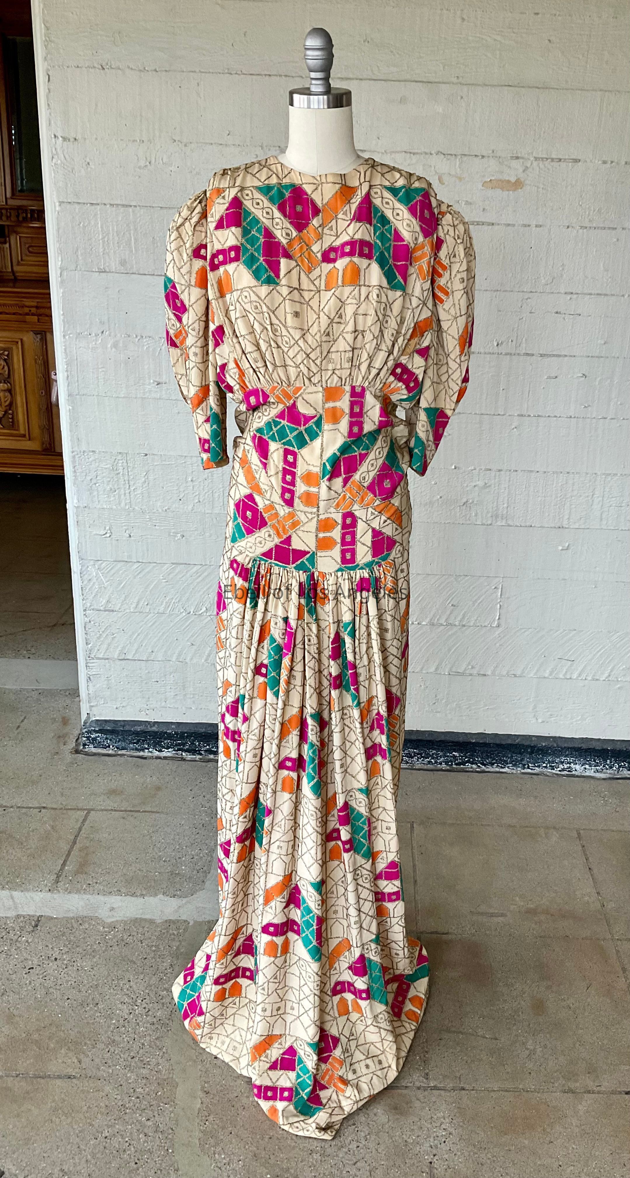 Multicolor printed crepe full length dress with metallic machine embroidery, padded gathered sleeves and waist panelCollection