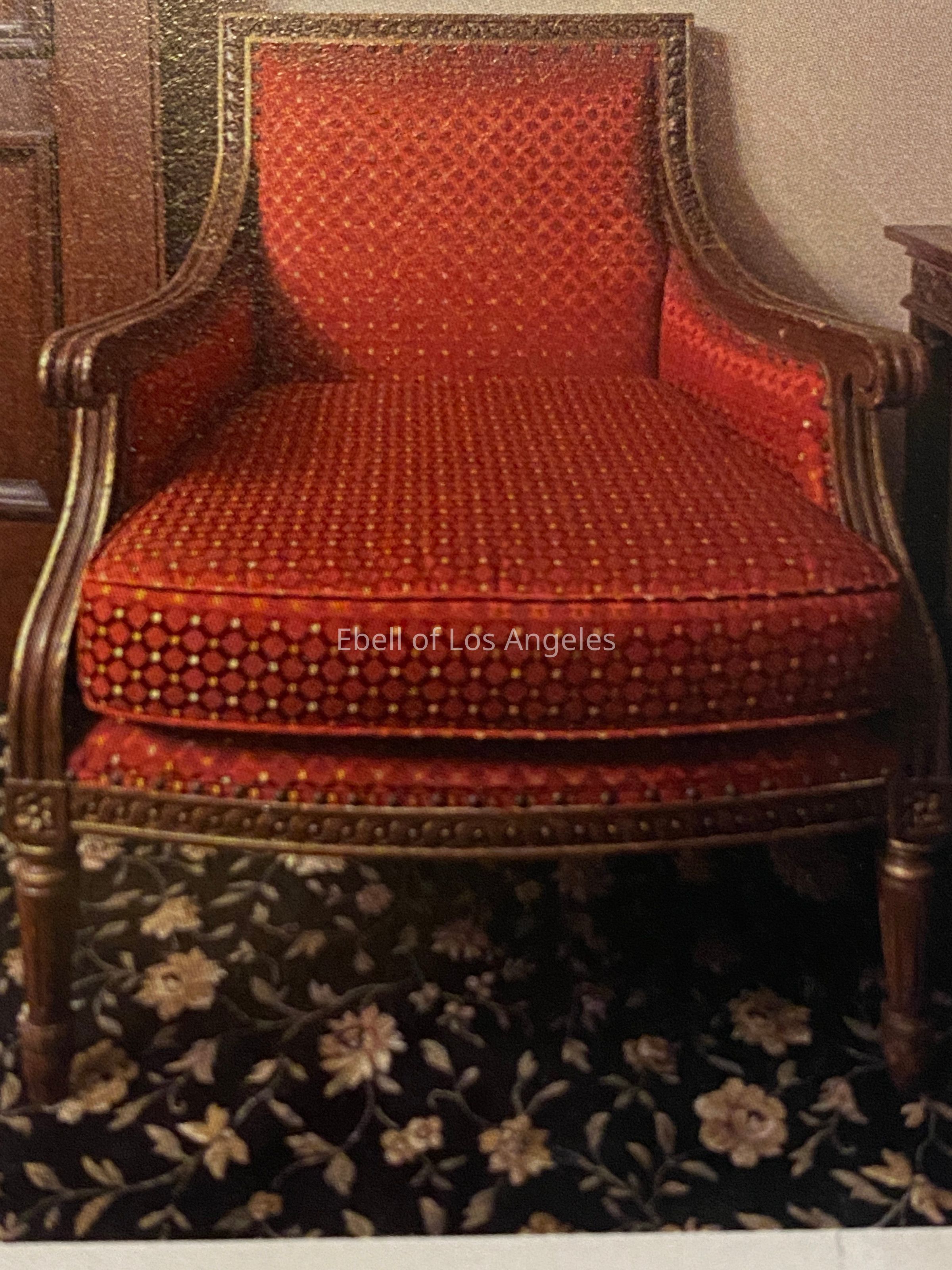 Pair of carved gold accented walnut armchairs with carving around entire frame and fluted legs topped with rosettes. The fitted backs and loose cushions are upholstered in red and gold diamond jacquard fabric.Collection