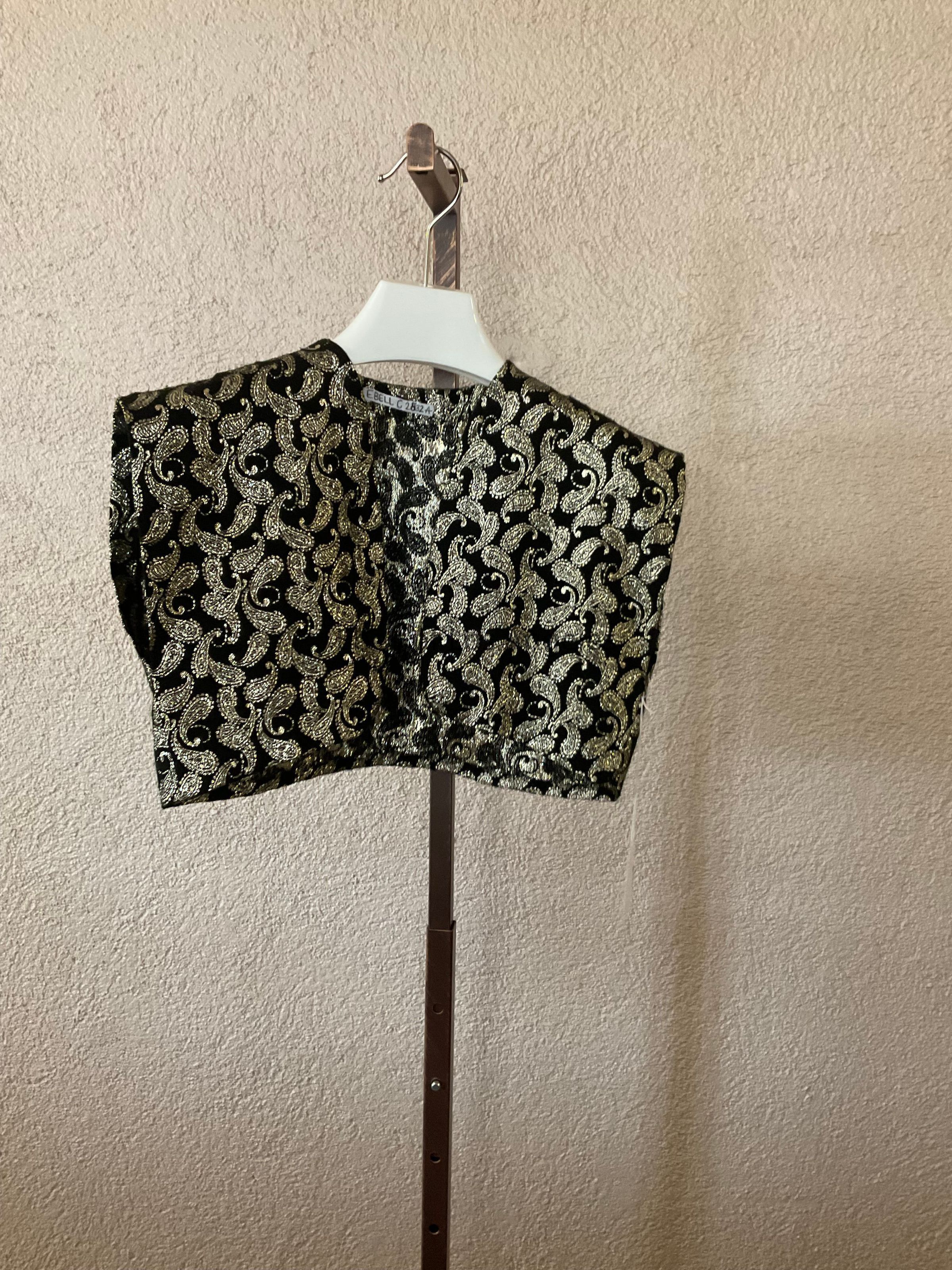 Sleeveless paisley brocade bolero with matching sleeveless dress with ruffle at hemEntry/Object ID