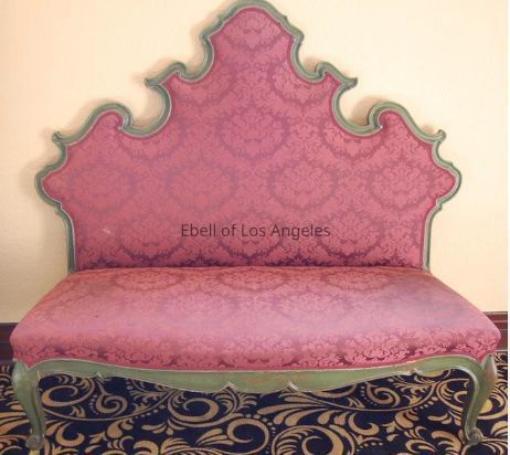 Set of four Louis XV Rococo style carved settees with carved back, painted green frame and fitted upholstered seat and back in pink silk damask.Collection