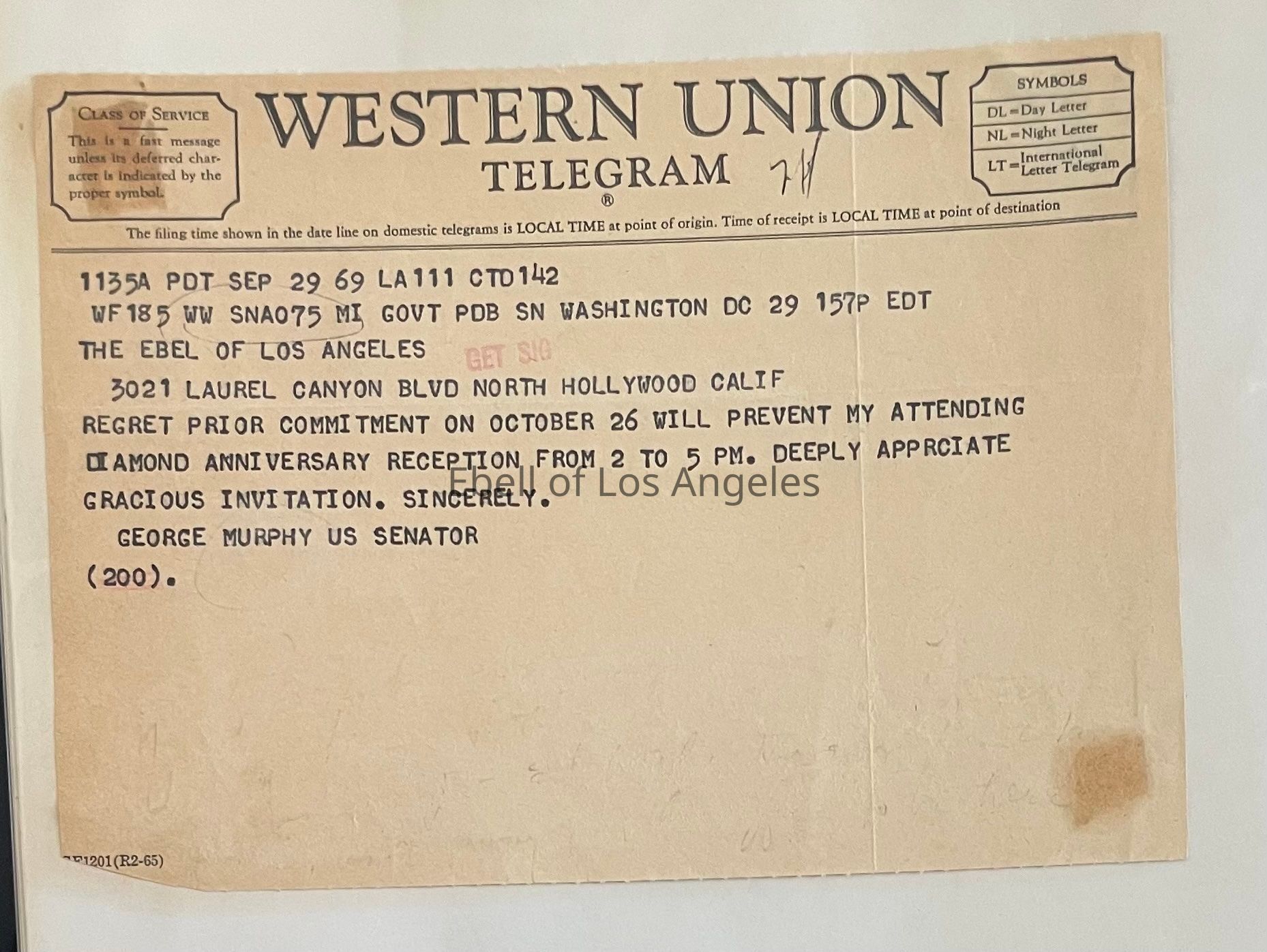 A scrapbook of news clippings, programs, announcements, telegram, napkins, calendar, and photos regarding the 75th Anniversary of the Ebell of Los Angeles. Includes photo of the Ebell Float for the "Tally-Ho" Fiesta de Los Angeles Parade, circa 1900s. Also includes a letter from the Los Angeles Public Library's History Division regarding placing copies of the Albro frescoes for the Art and Music Department and California Biography File.Archive Details