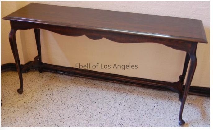 Queen Anne style dark stained sofa or console table with a scalloped apron and cabriole legs.