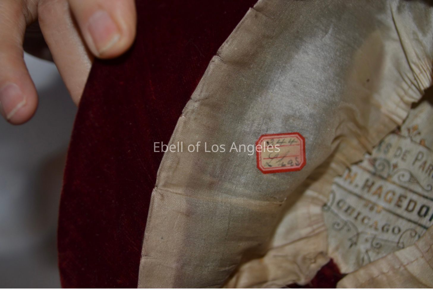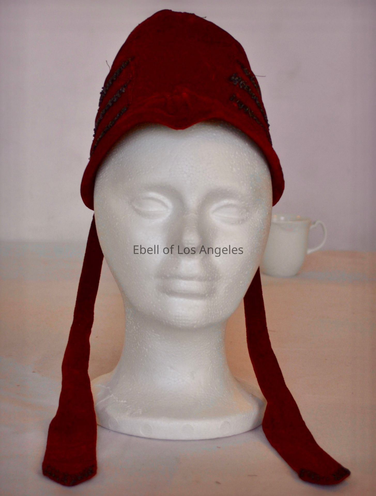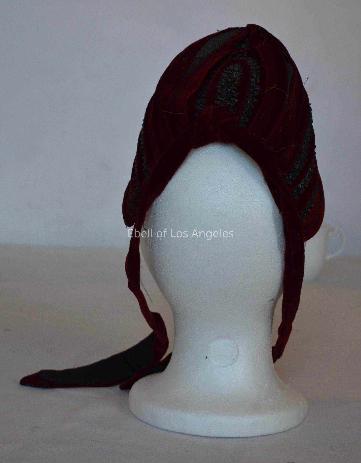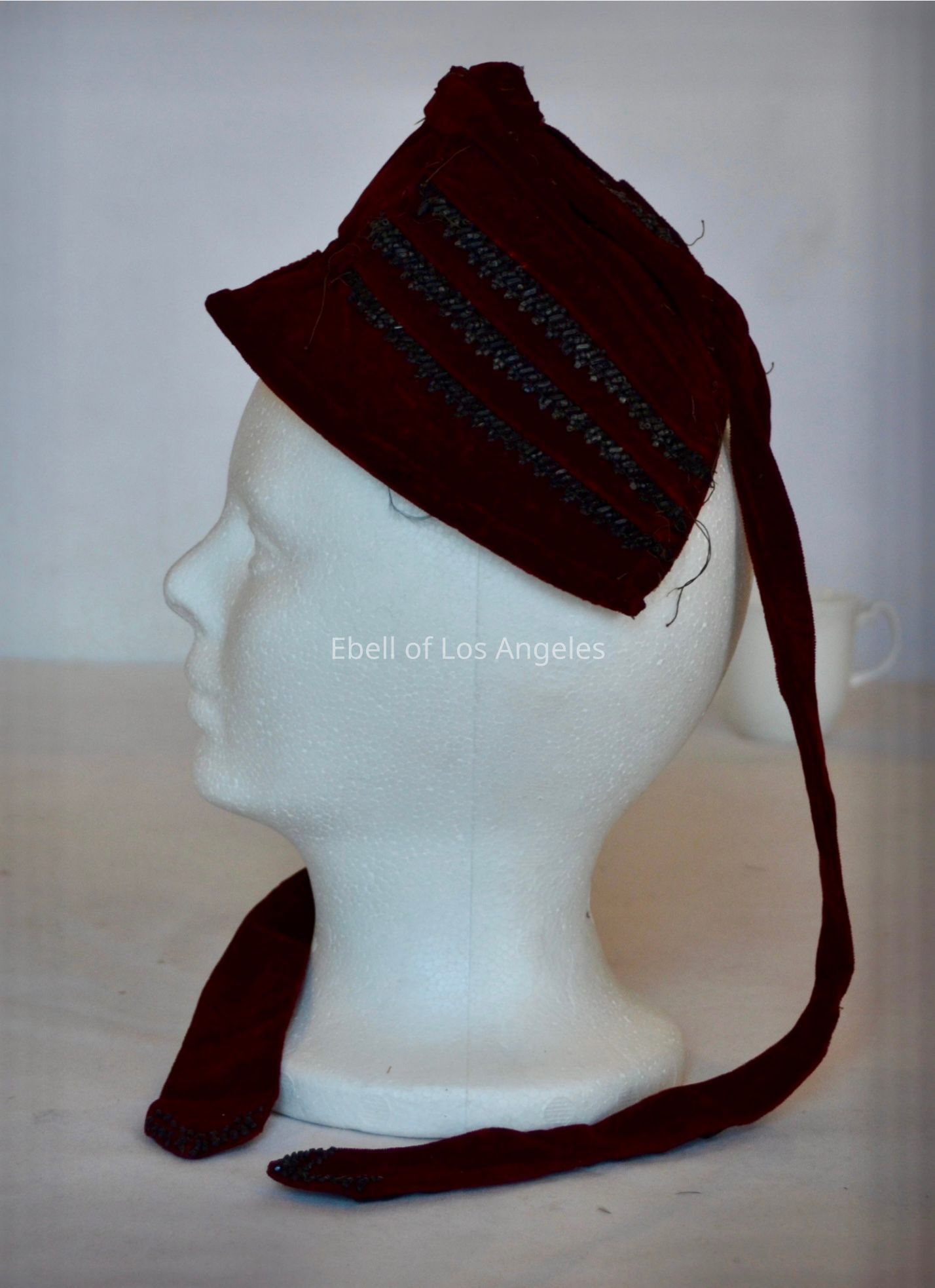 Red velvet child’s bonnet with black beaded trim and self tieCollection