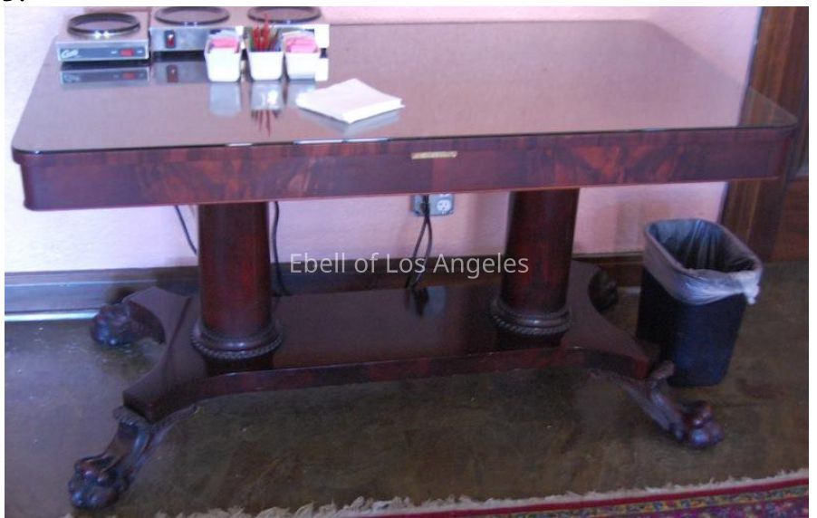 Mahogany library table with two round pedestals sitting atop a rectangular base with four lion's paw feet.Collection