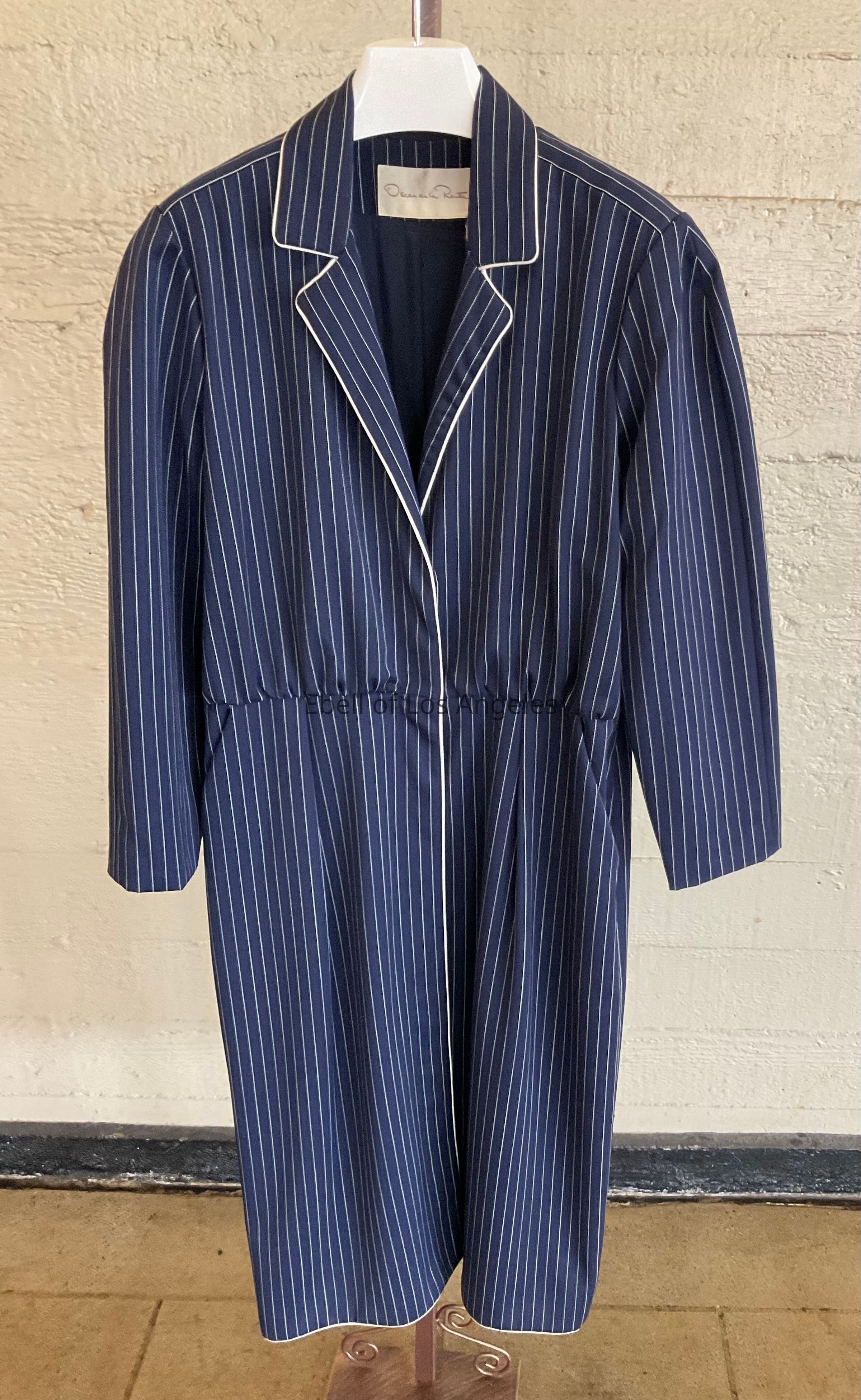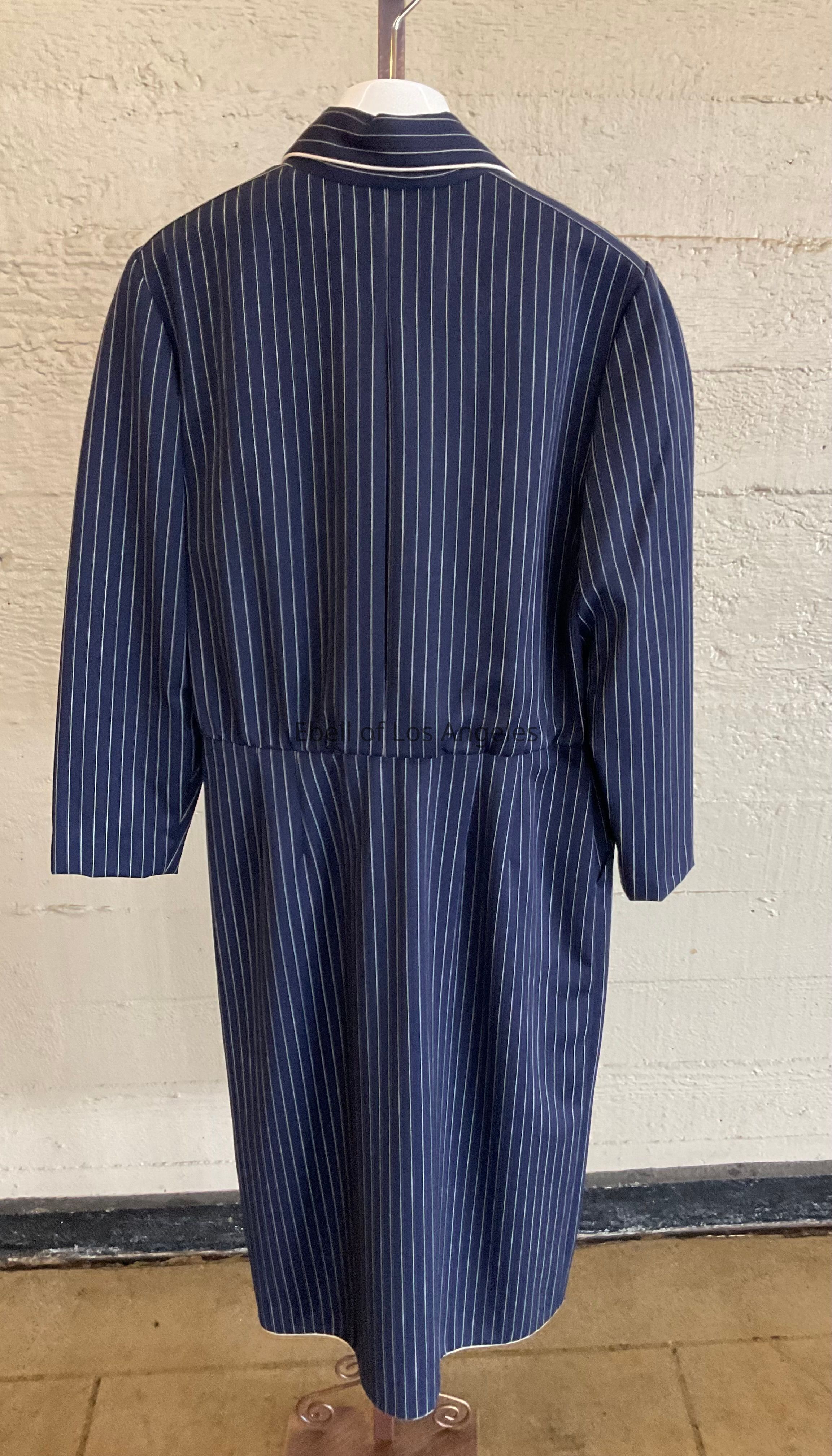 Navy pinstripe button down shirt dress with side pockets and pipingEntry/Object ID
