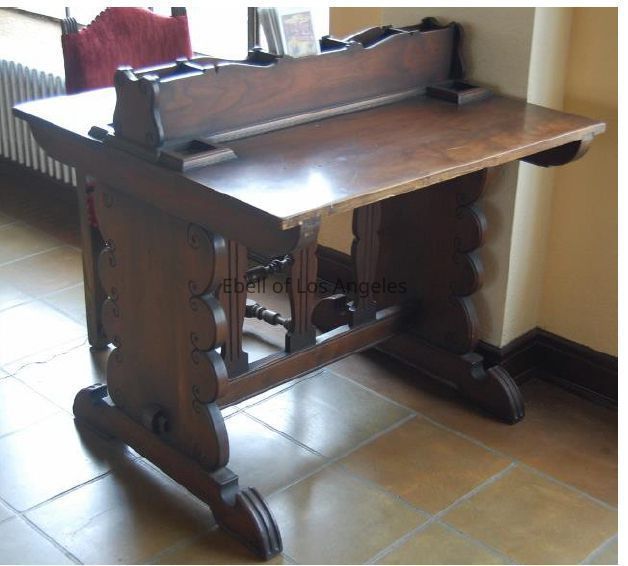 Renaissance style walnut two-sided library table (or desk) with trestle base. The center is divided by five wood compartments and the side legs are scalloped with fluted feet.Made/Created