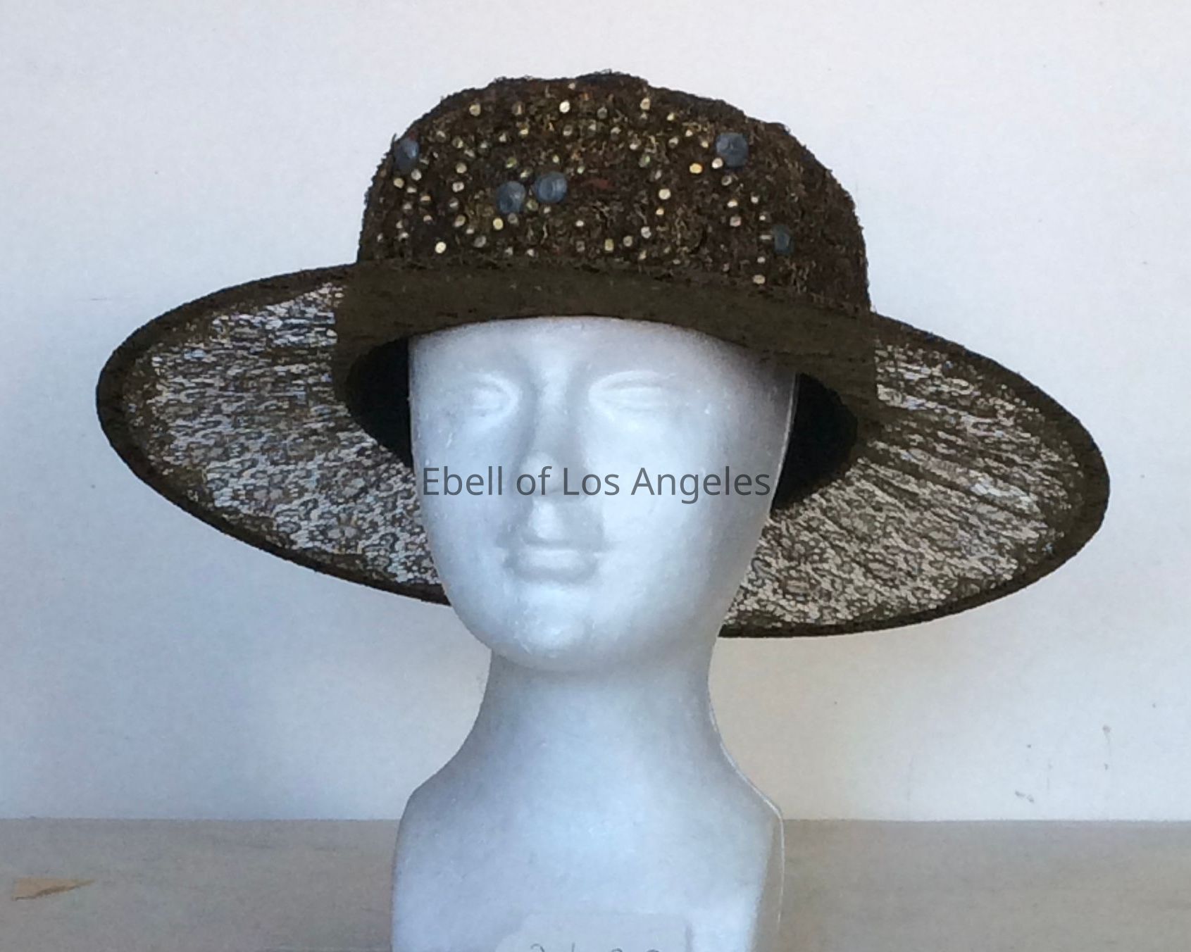 Velvet crown with jeweled hat band and beige lace brim and matching hatpinCollection