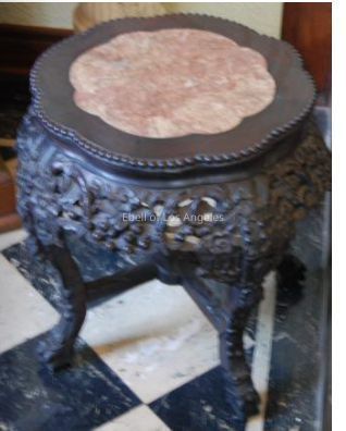 Chinese carved hardwood low table with circular and scalloped pink marble inlaid top supported by cabriole legs. There is carved beading along the outside edge of the scalloped top and open elaborate carving around sides of table.Collection