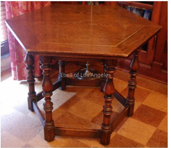 Oak octagonal occasional table with six turned legs and plain stretcher bars.