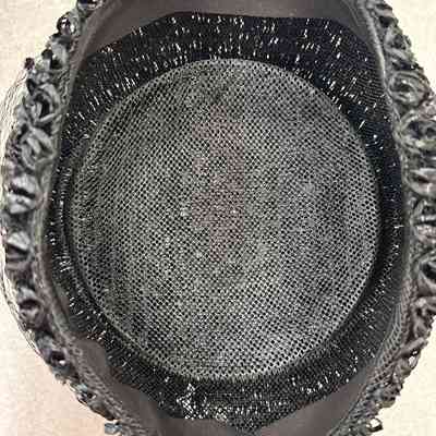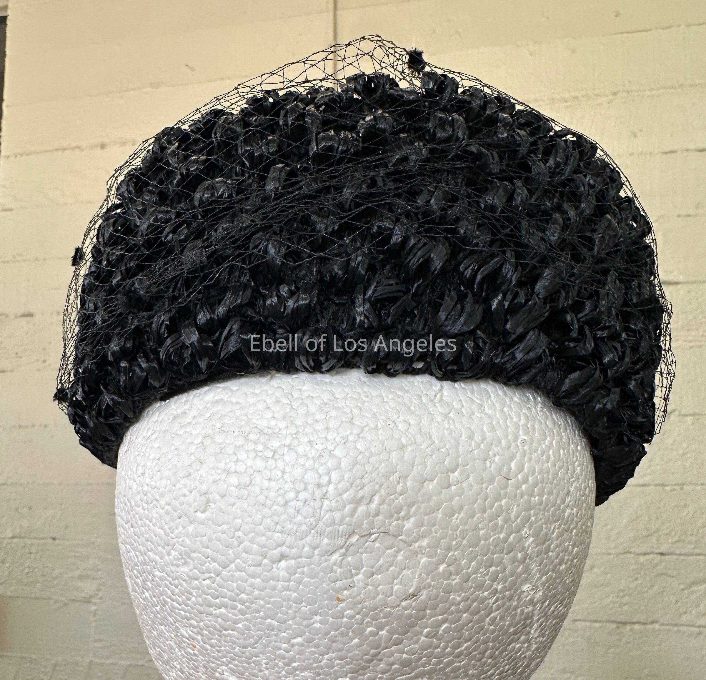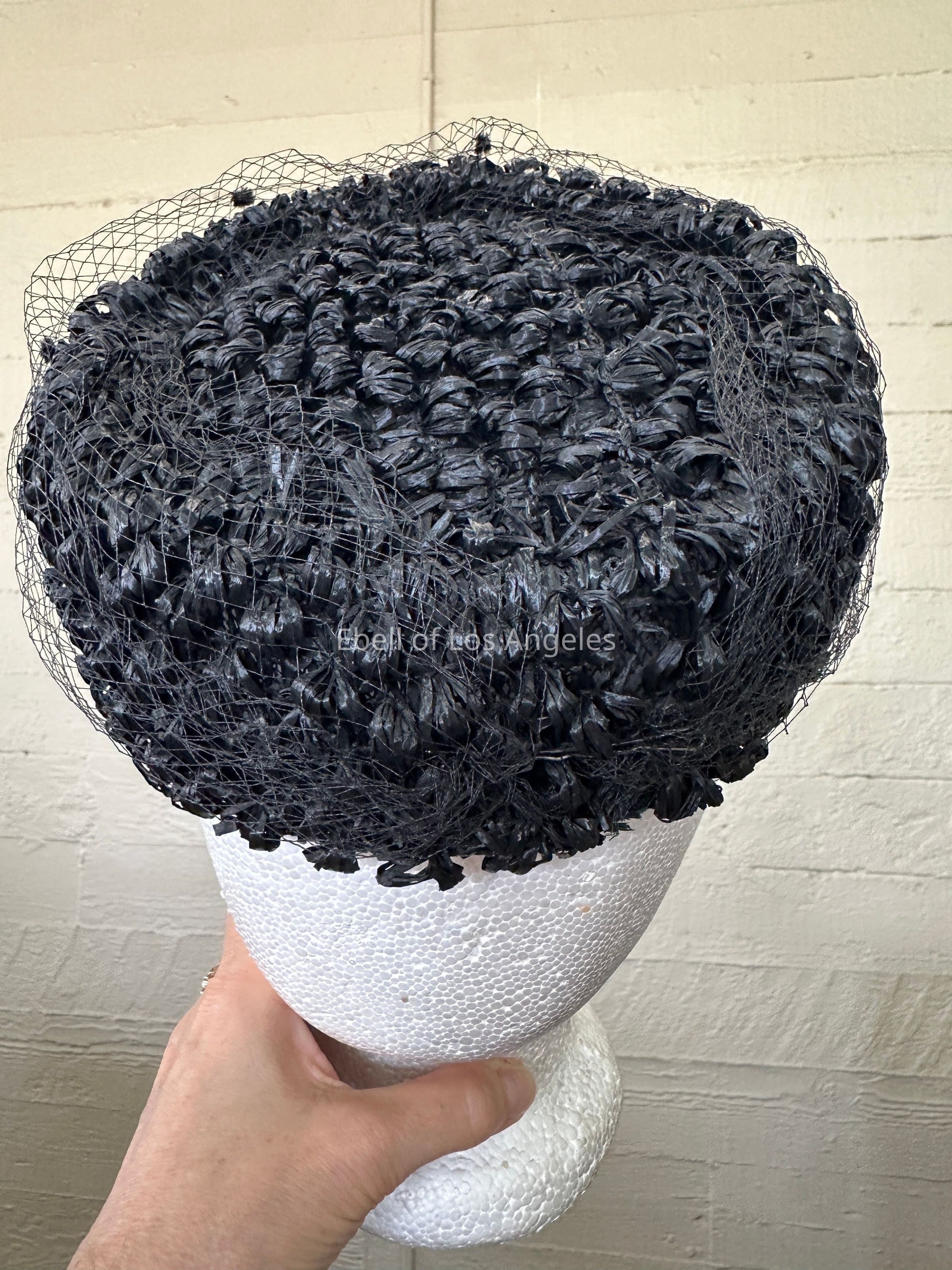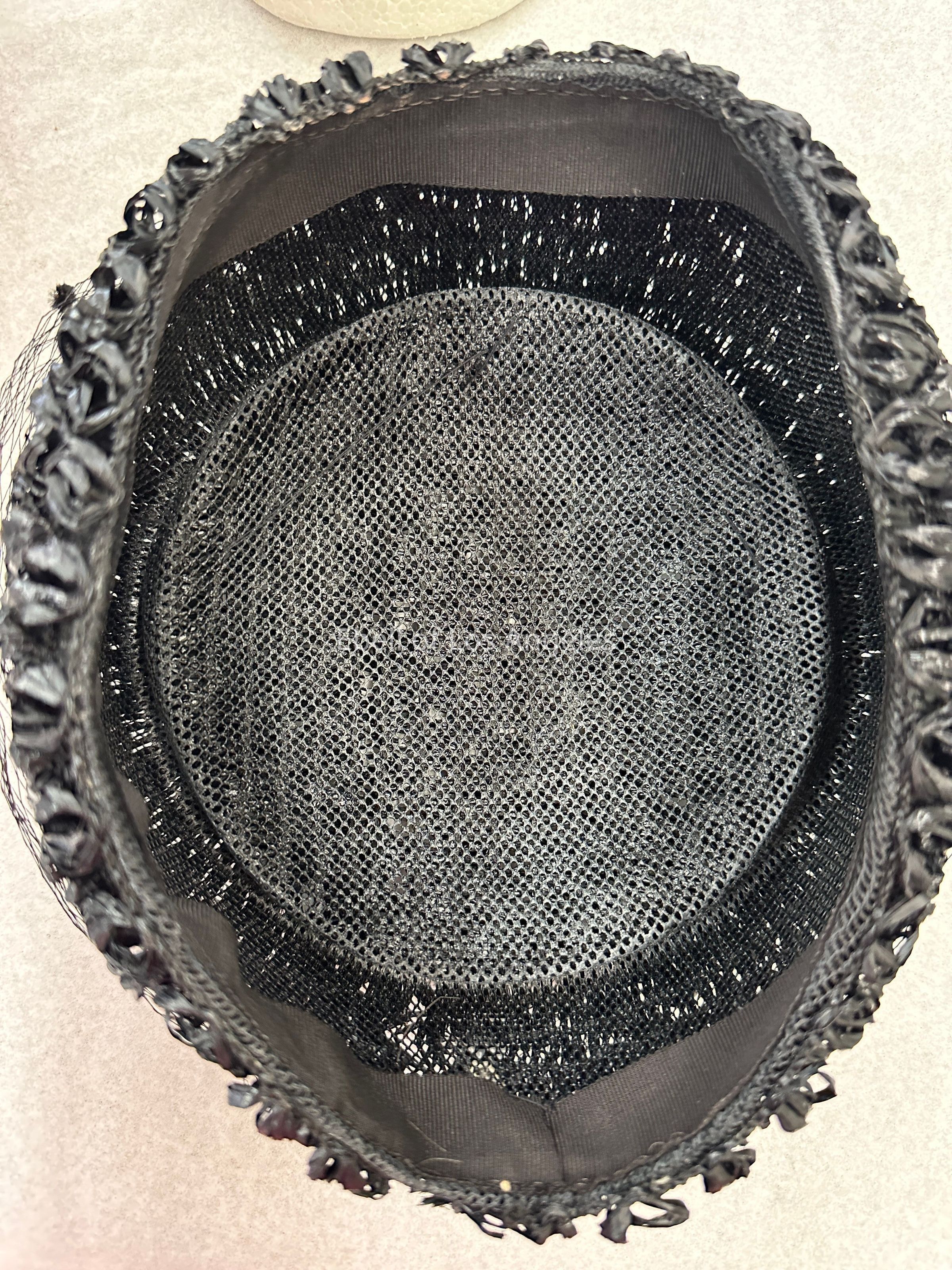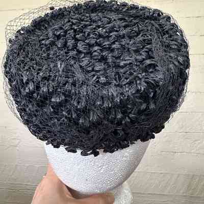 Hat, Pill Box Black Hat, Curled Straw with Black Net