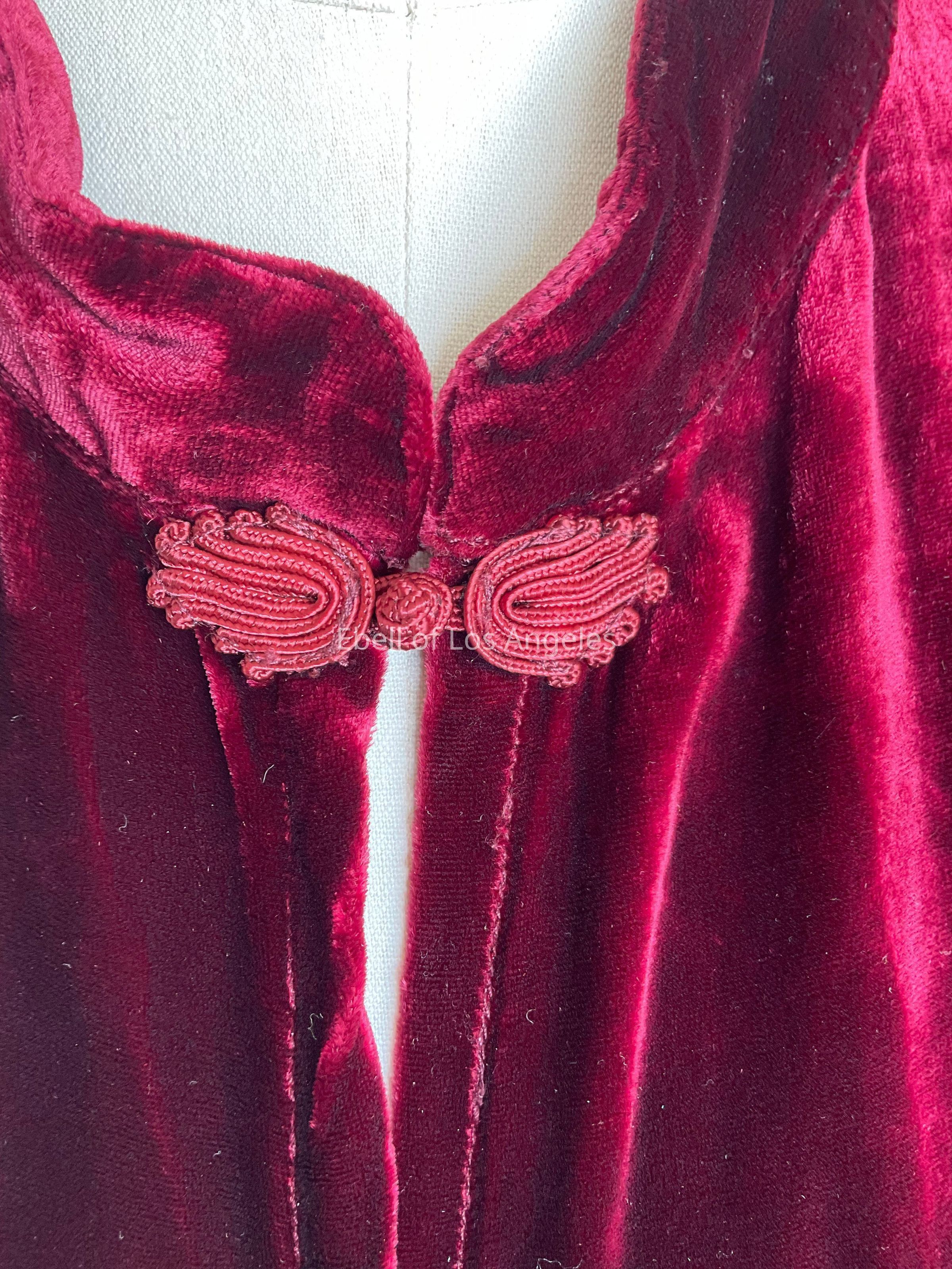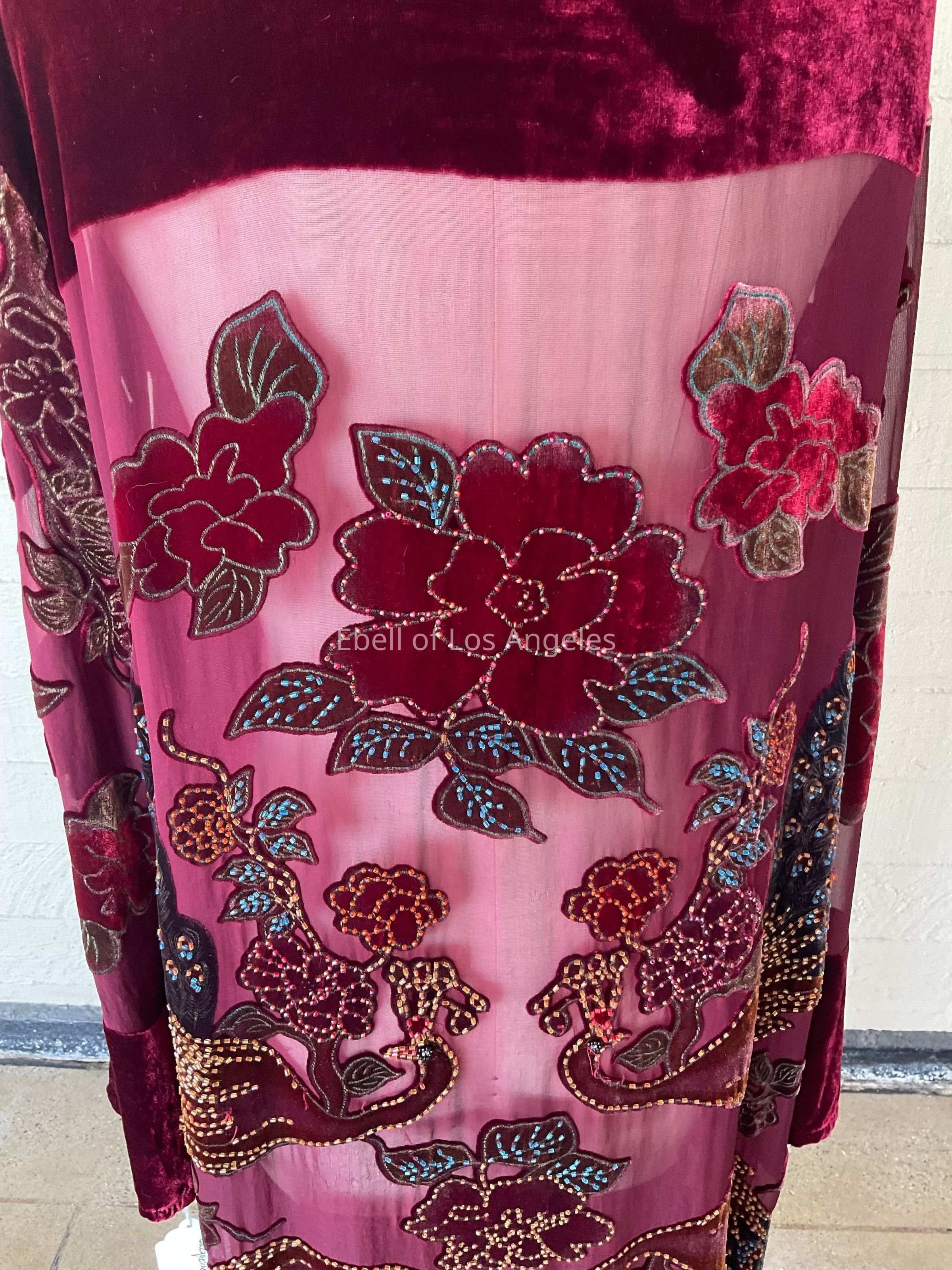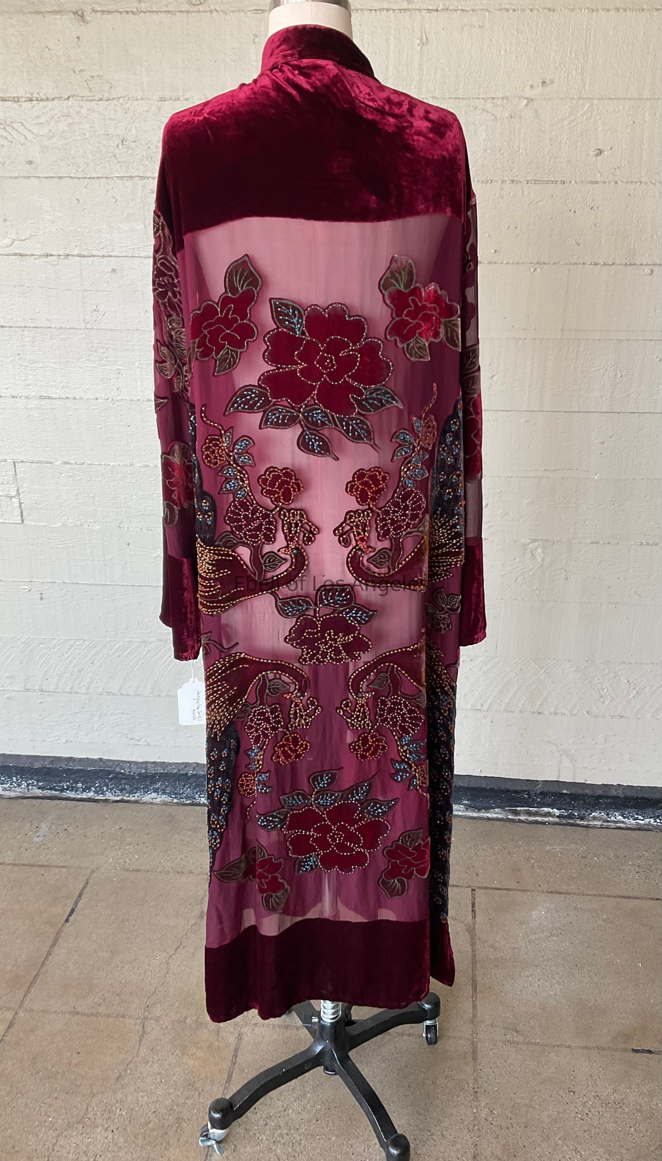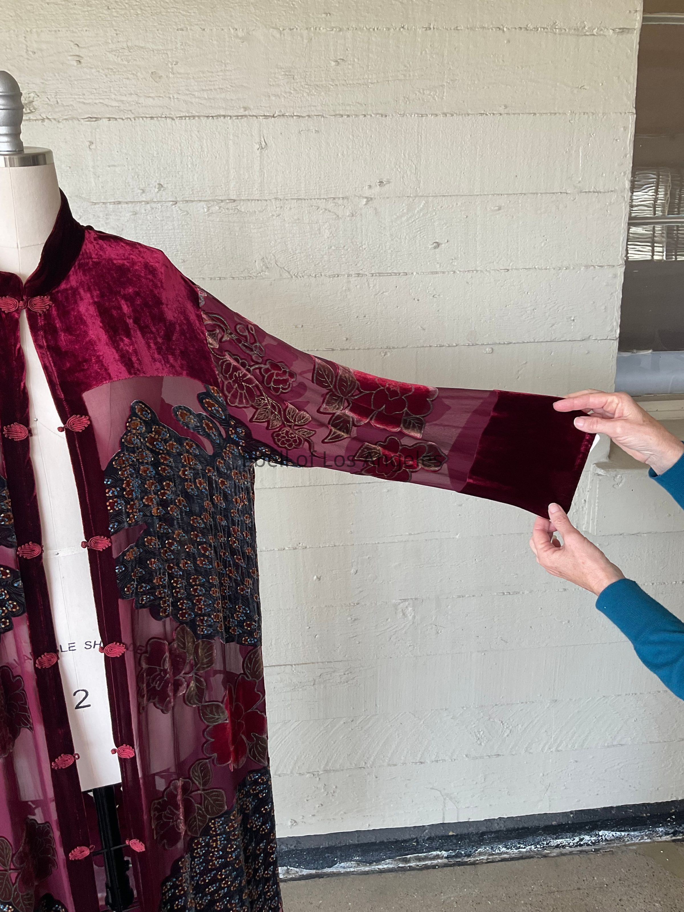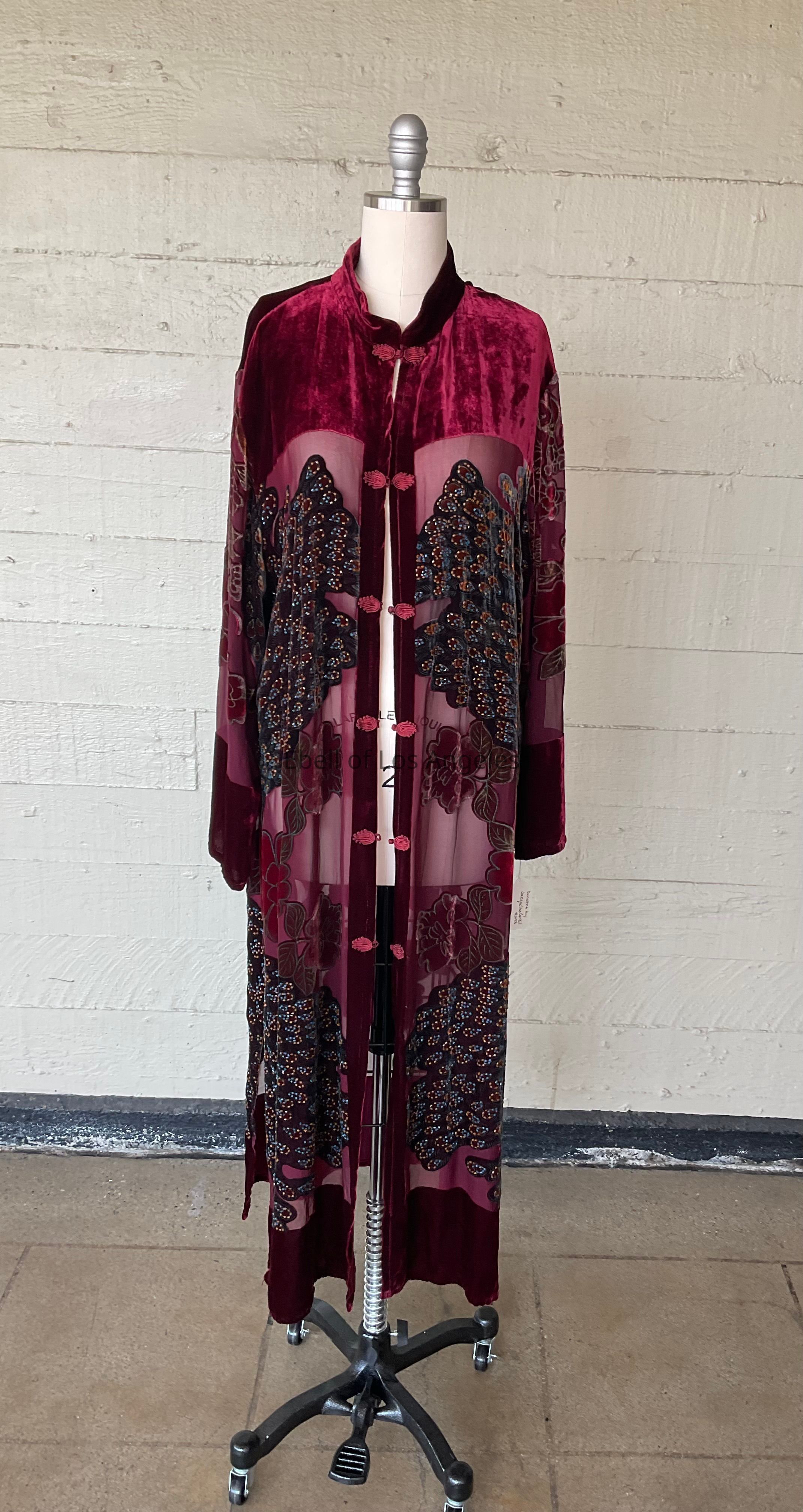 Chiffon and velvet embellished evening coat with mandarin collar and frog closure