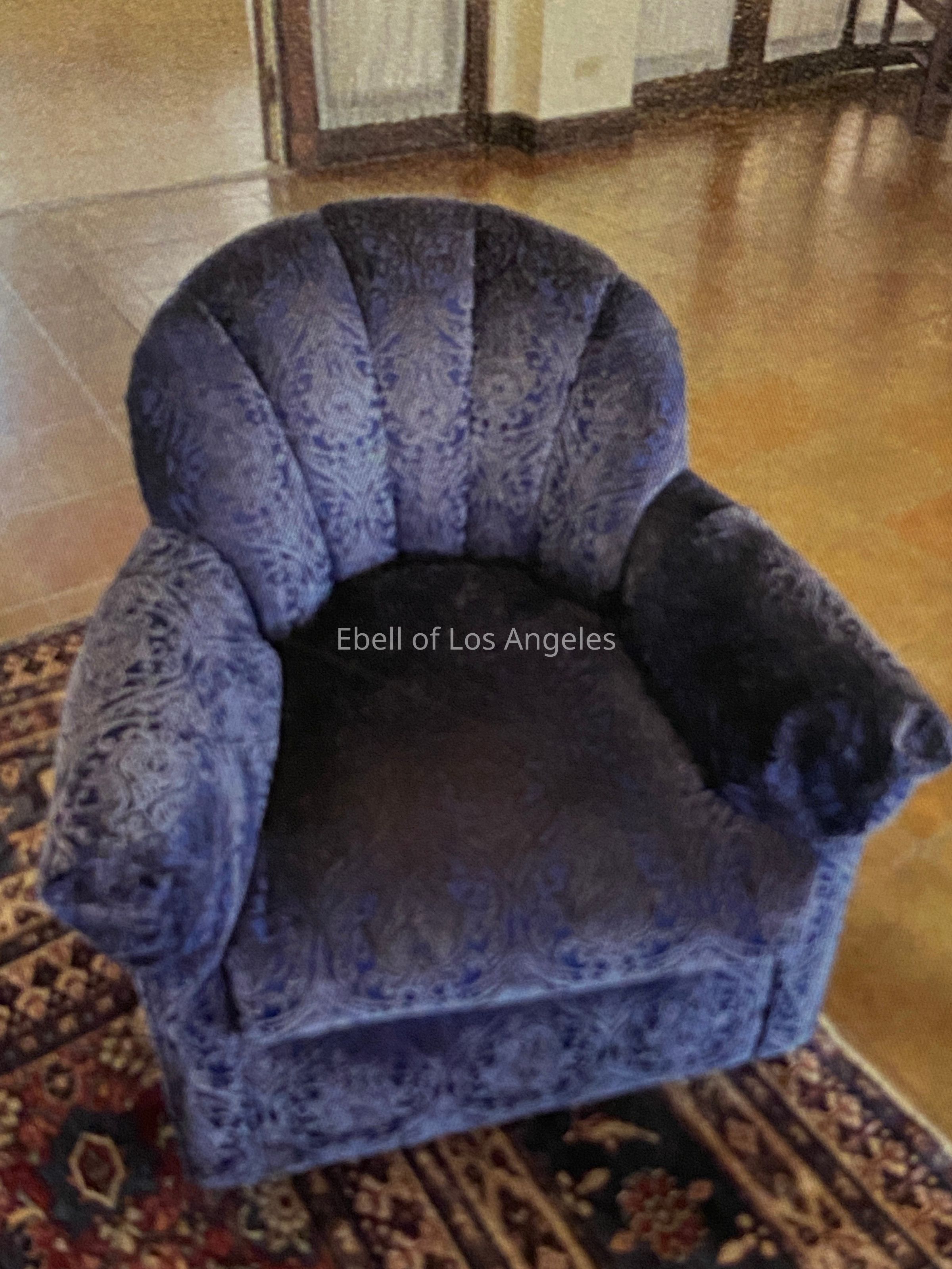 Pair of two armchairs with arched, channel welted backs and curved arms upholstered in blue damask velvet.