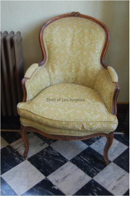 Louis XV style carved beechwood fauteuil a la Reine with carved floral accents and loose seat cushion, fitted back, sides and armrests all upholstered in a yellow silk damask.