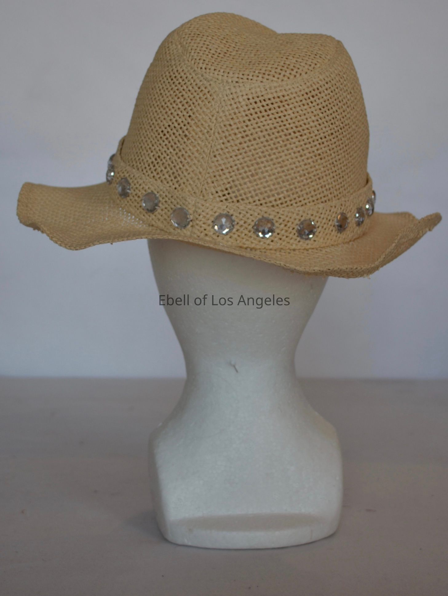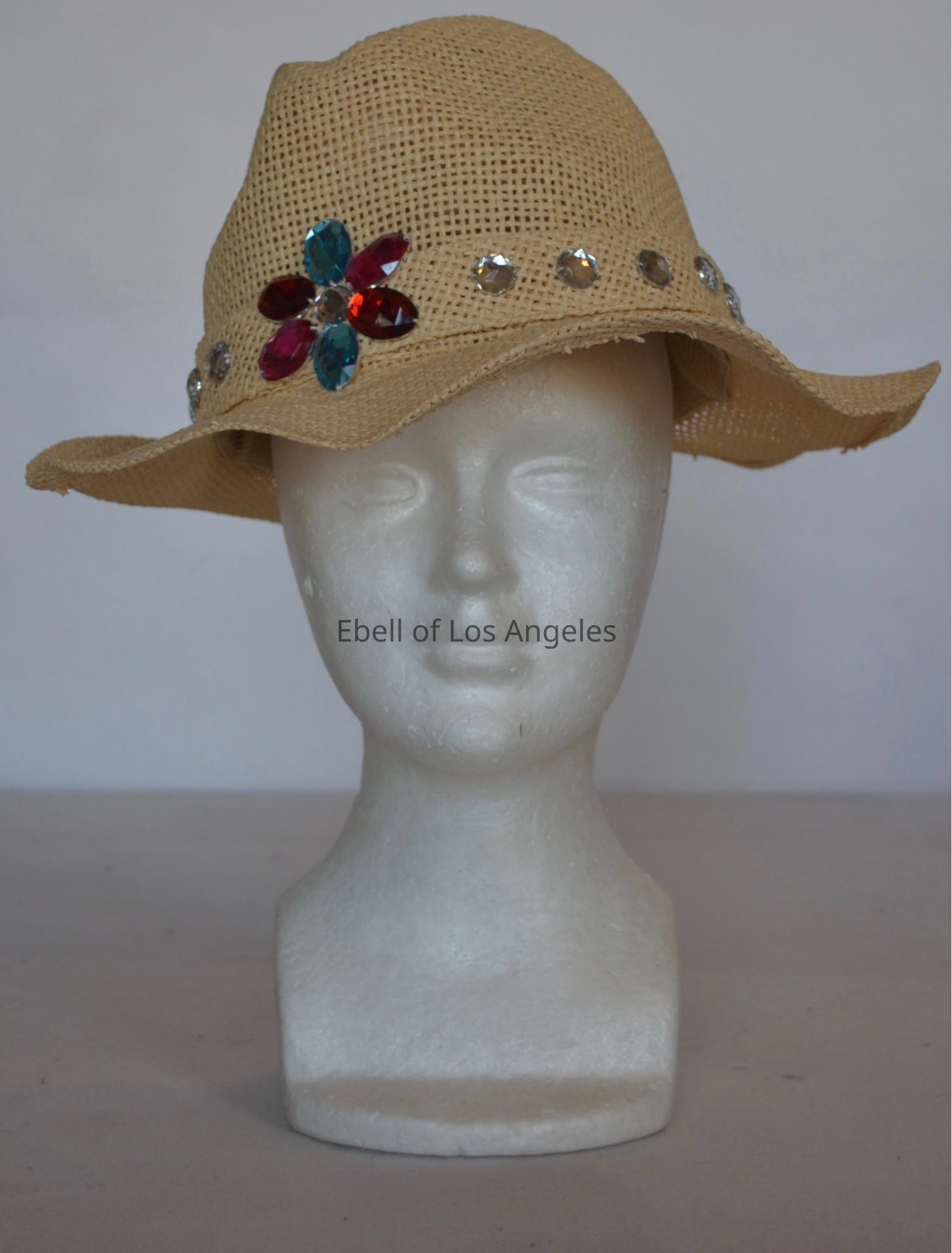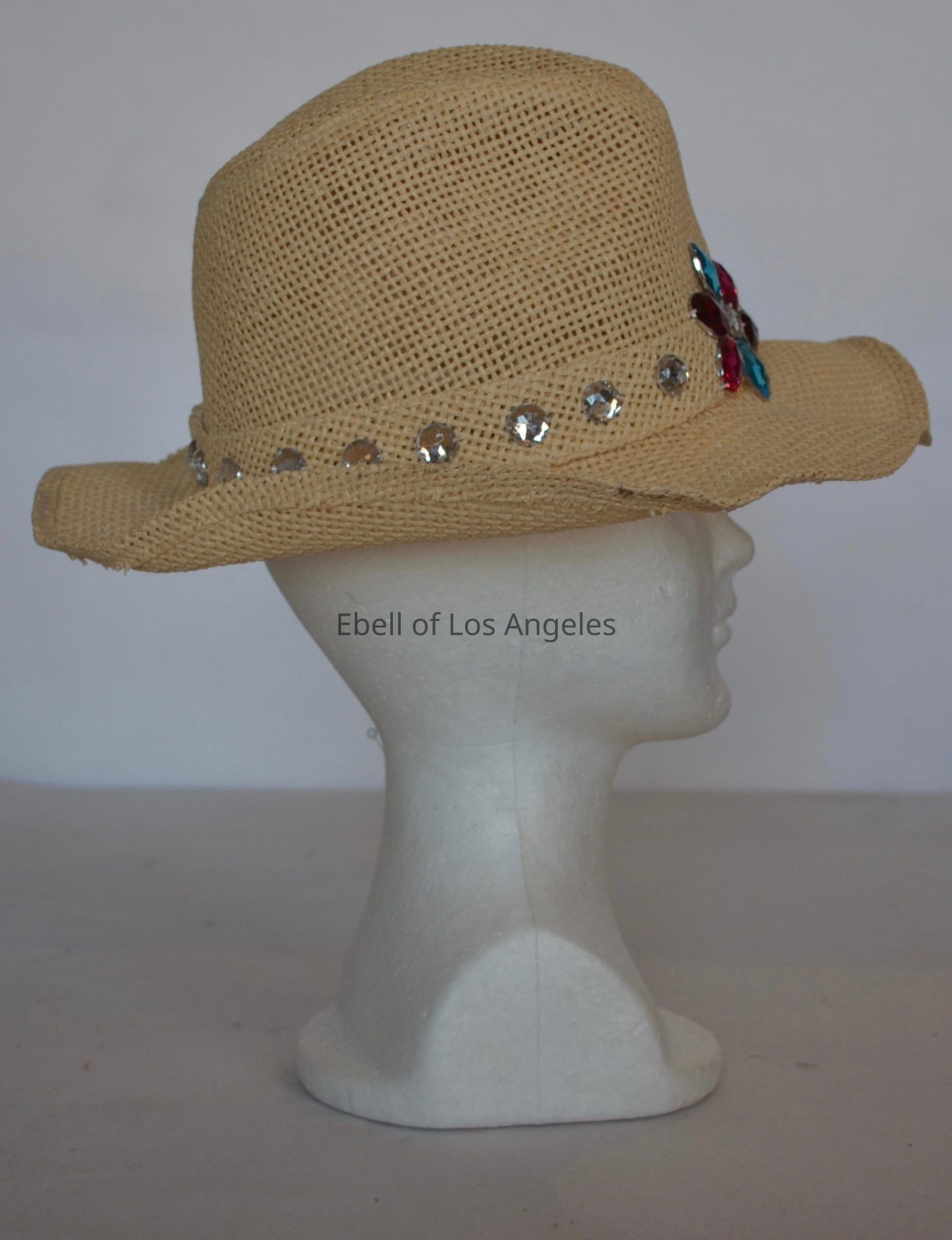 Straw hat, high crown, narrow floppy brim, decorative crystal embellishment on self hatbandEntry/Object ID
