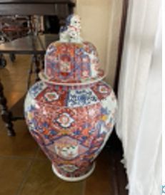 Lidded urns with lion handle Pair of ceramic urns with lids decorated with Chinese Lion.