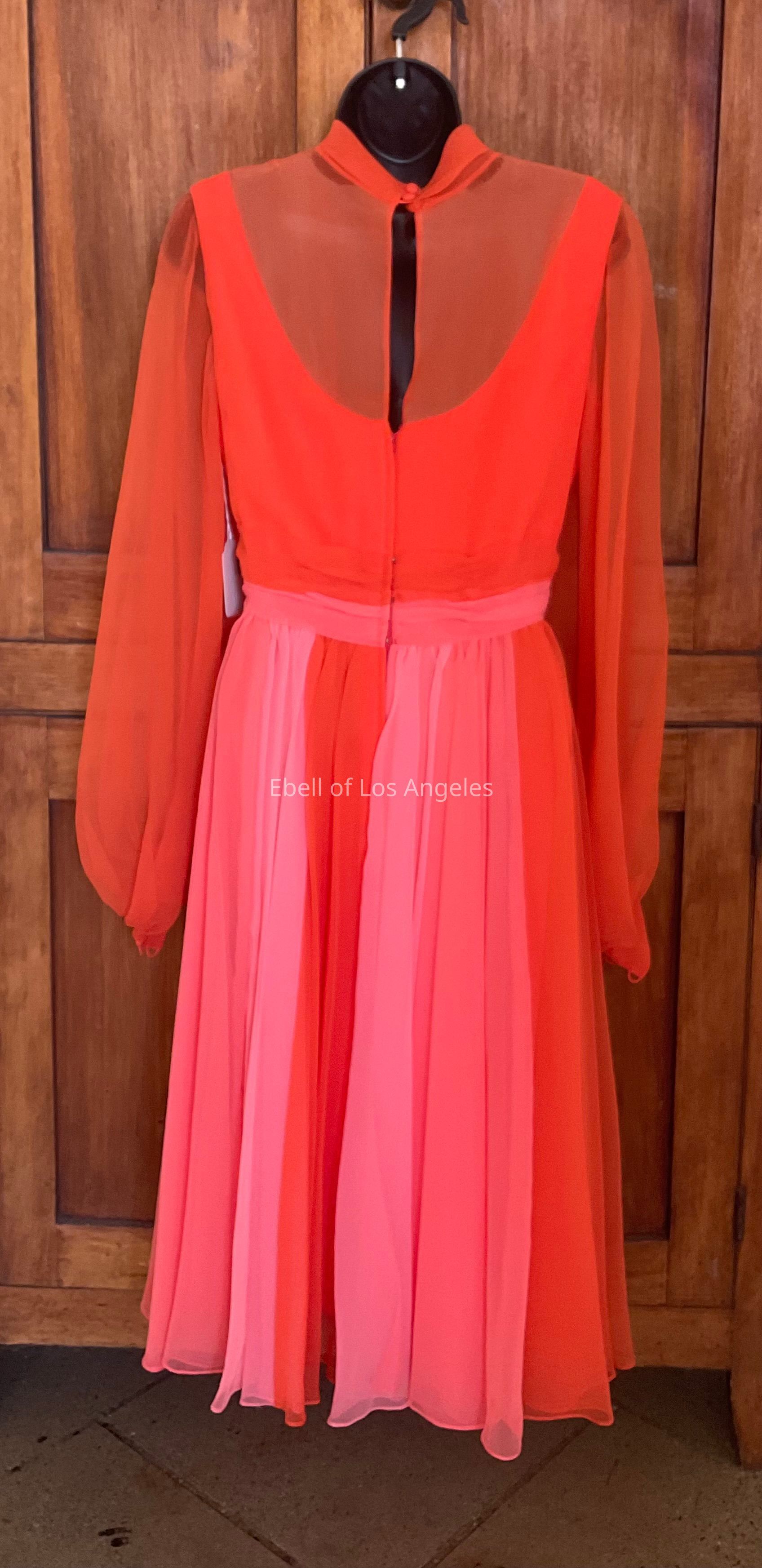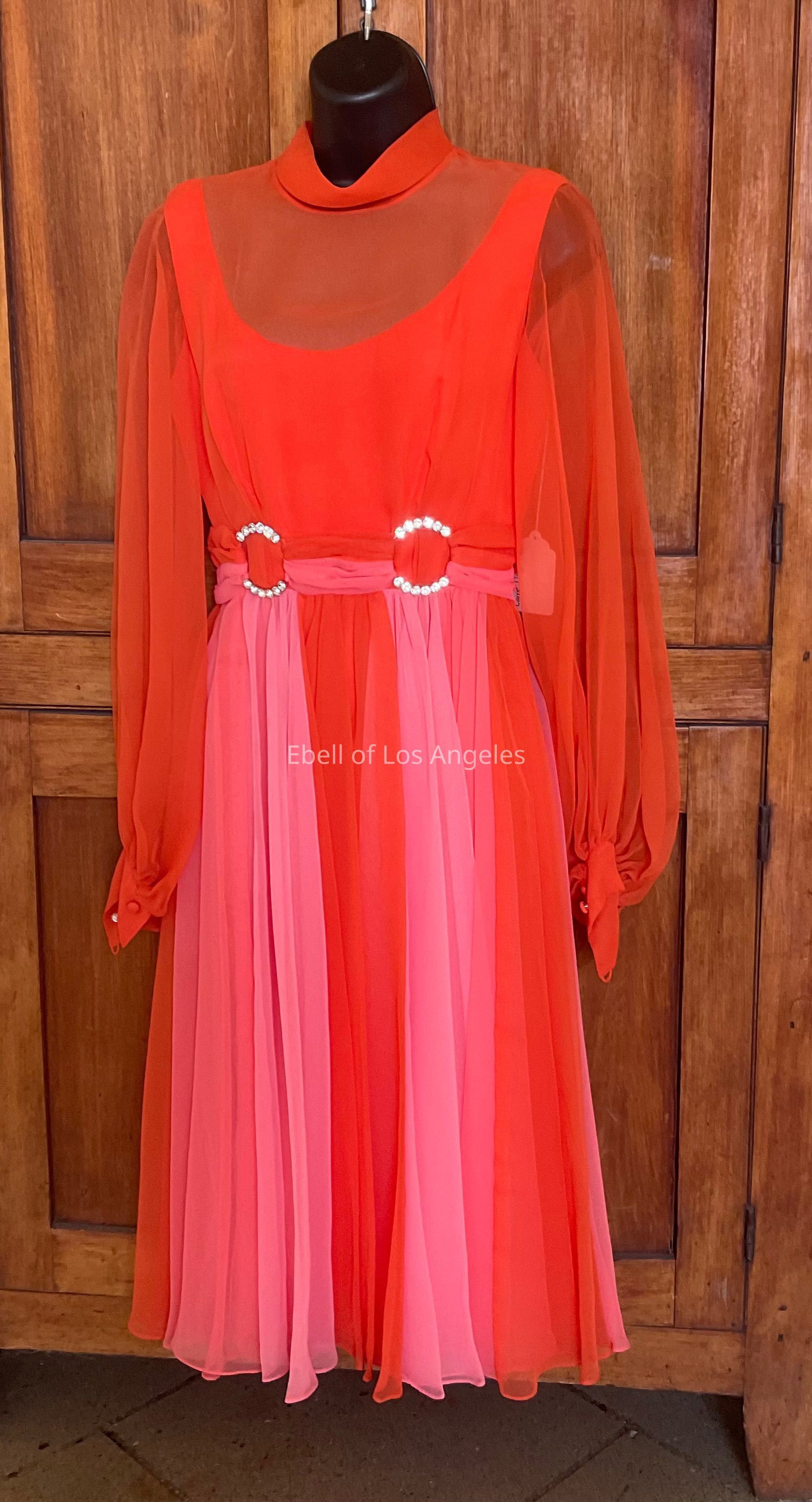 Long sleeve knee length chiffon dress with high collar and 2 rhinestone buckles, full skirt with contrast panelsCollection