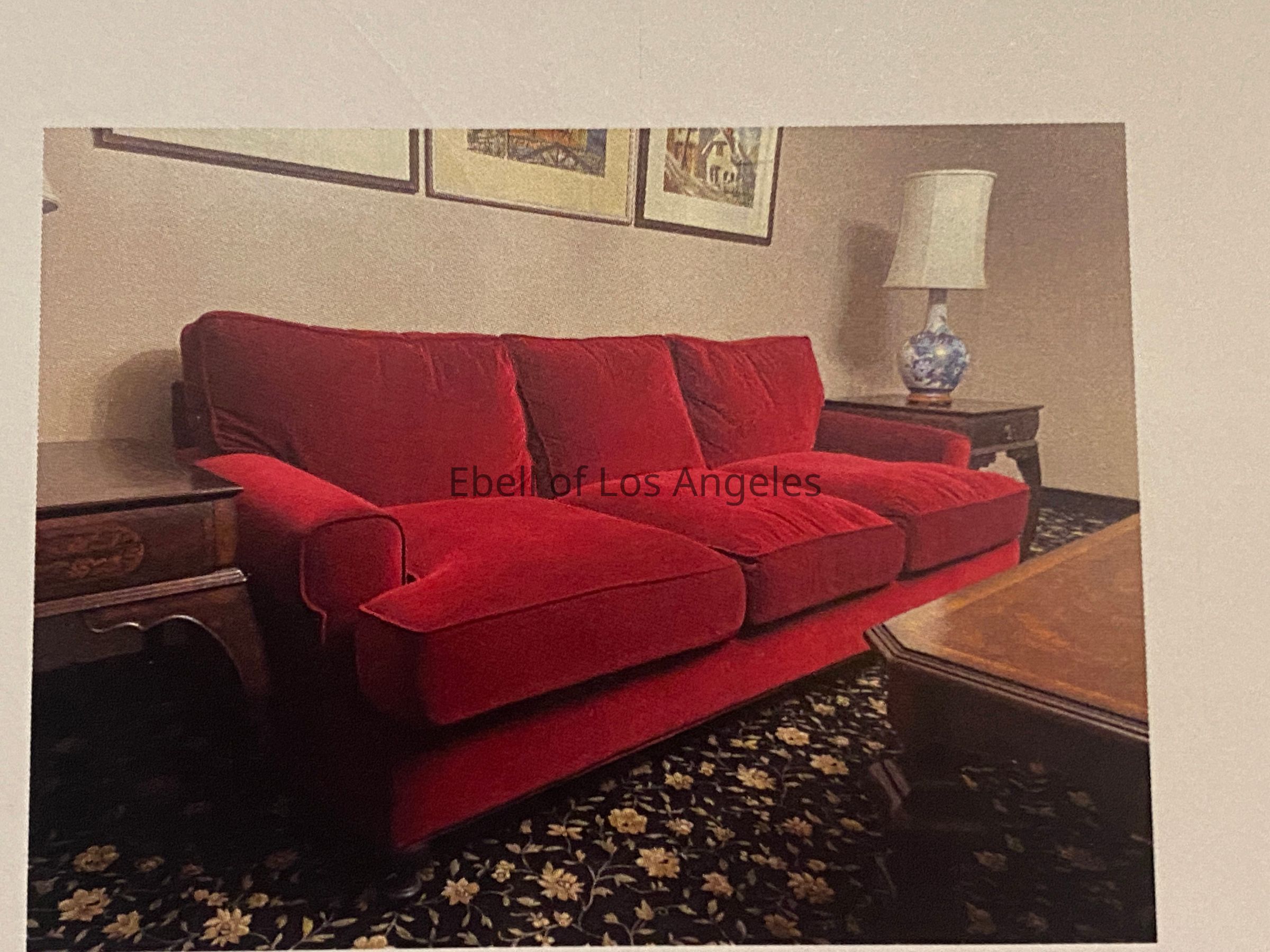 Dark red velvet three cushion sofa with loose back and seat cushions and box arms.