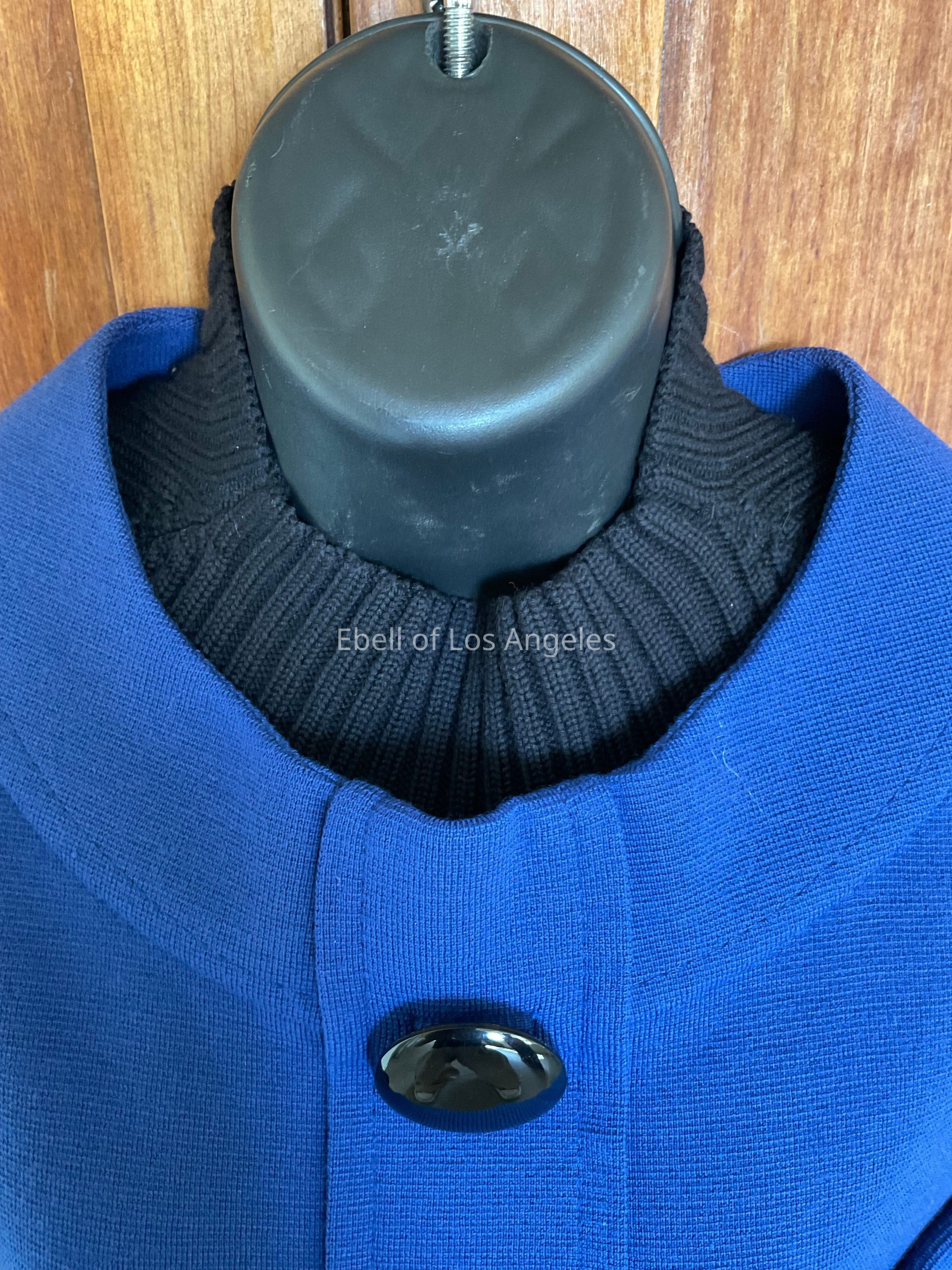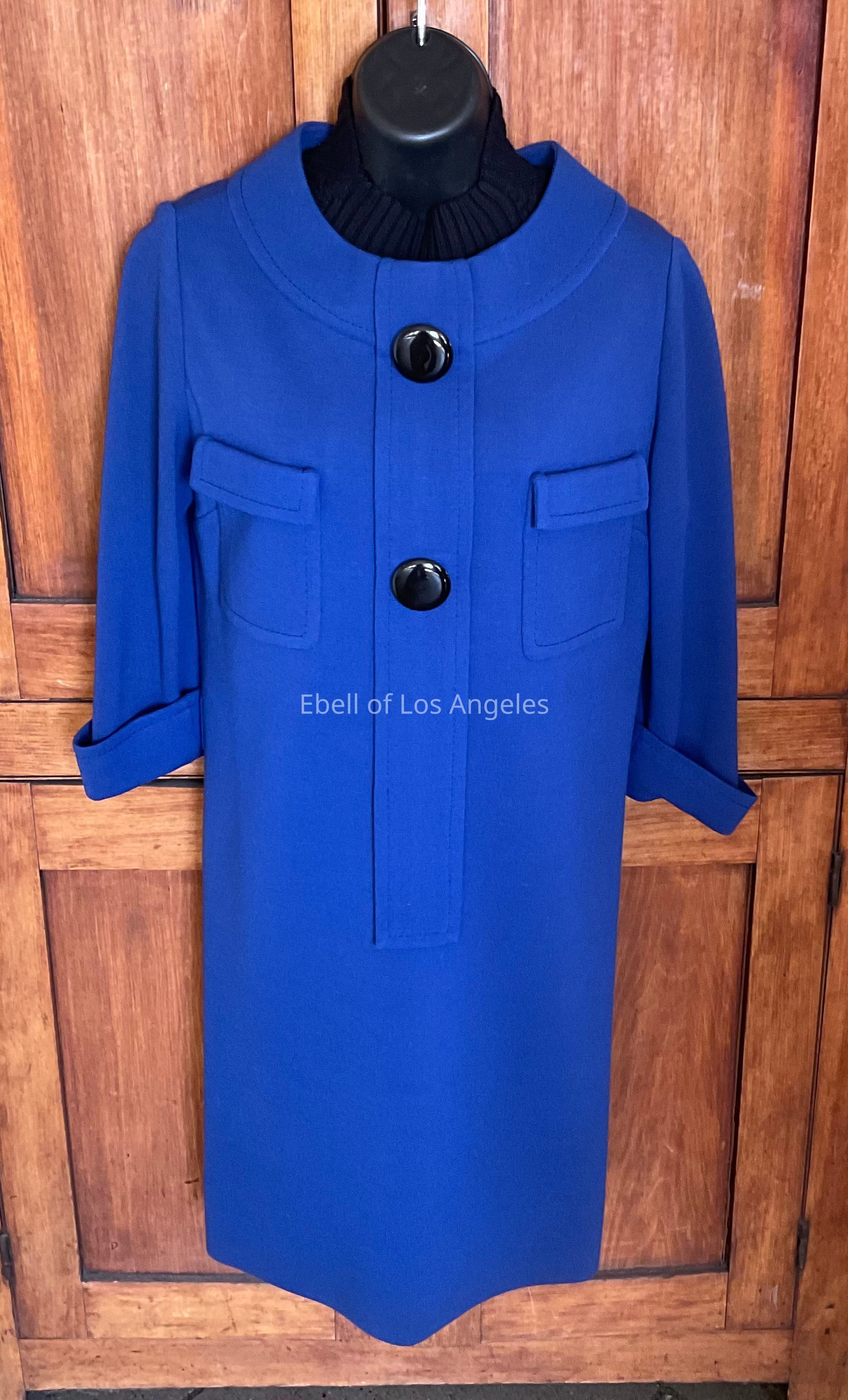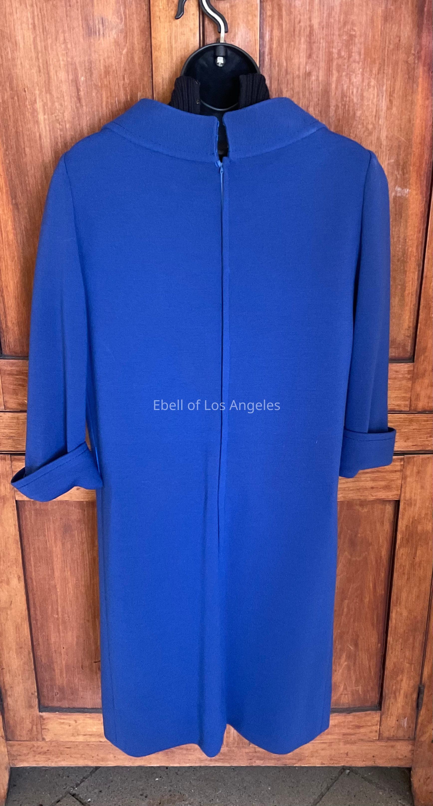 Knit knee length sheath with 3/4 length cuffed sleeves, black turtleneck ribbed dickey, 2 decorative buttons and 2 patch pockets on chestCollection