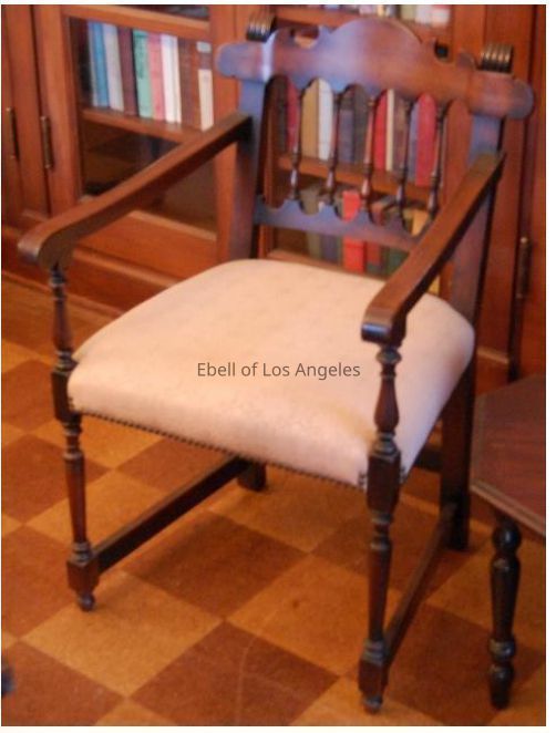 Set of four turned spindle backed armchairs with fitted seat cushion upholstered in white seashell fabric and bordered in nail heads.