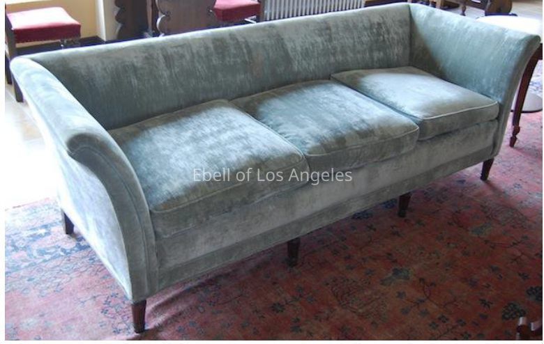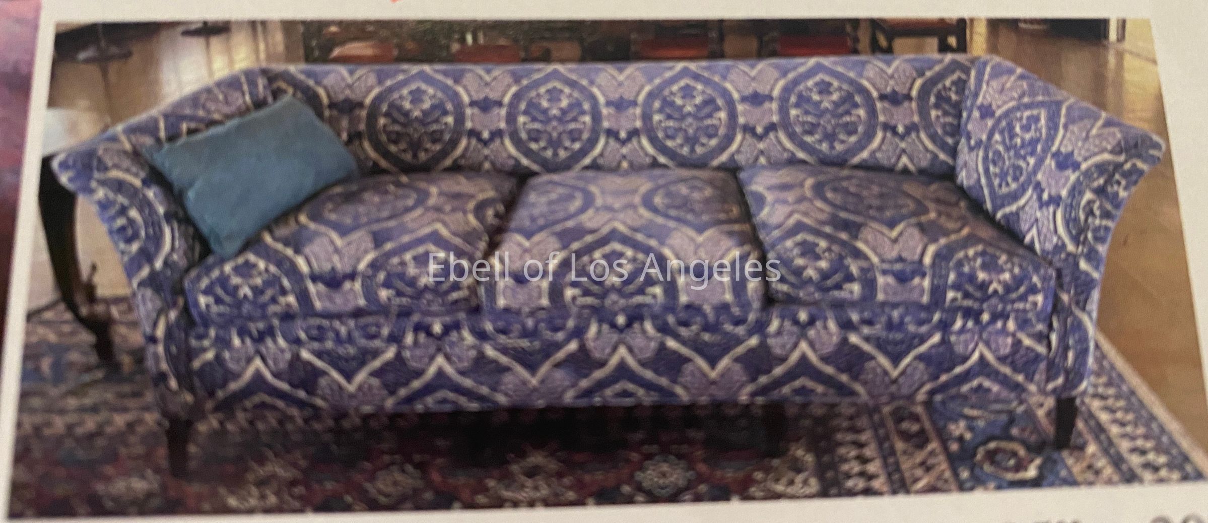 Pair of classical style sofas with blue and white damask upholstery, three loose cushions, low back and curved arms.