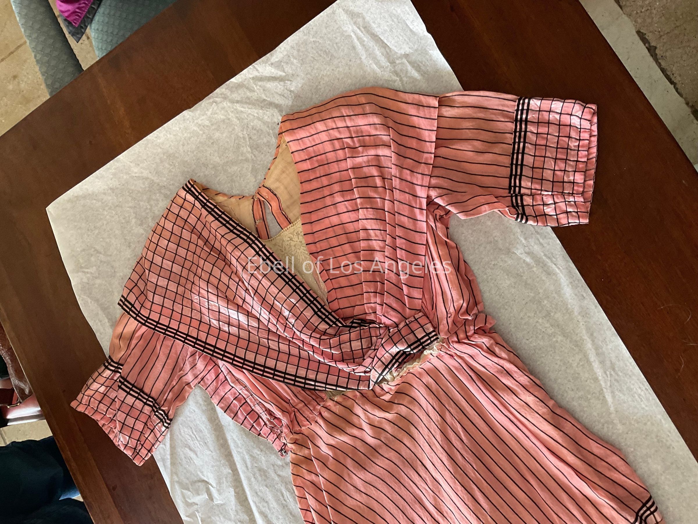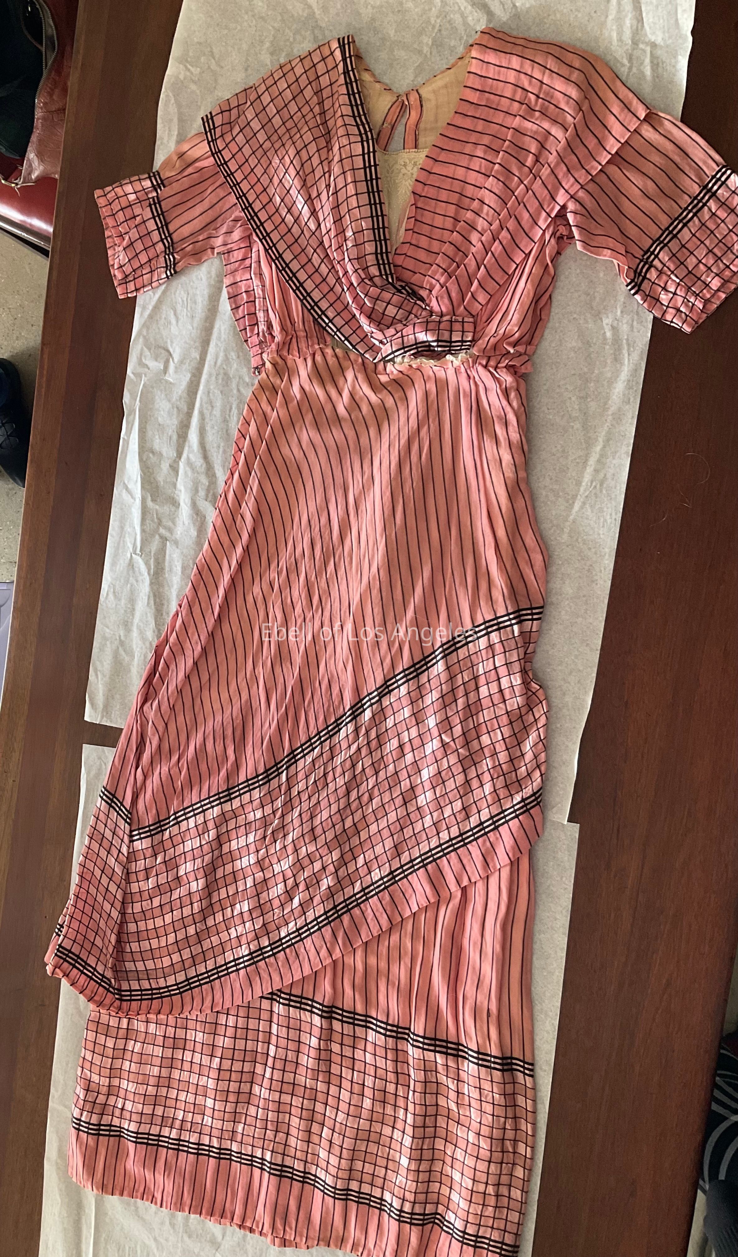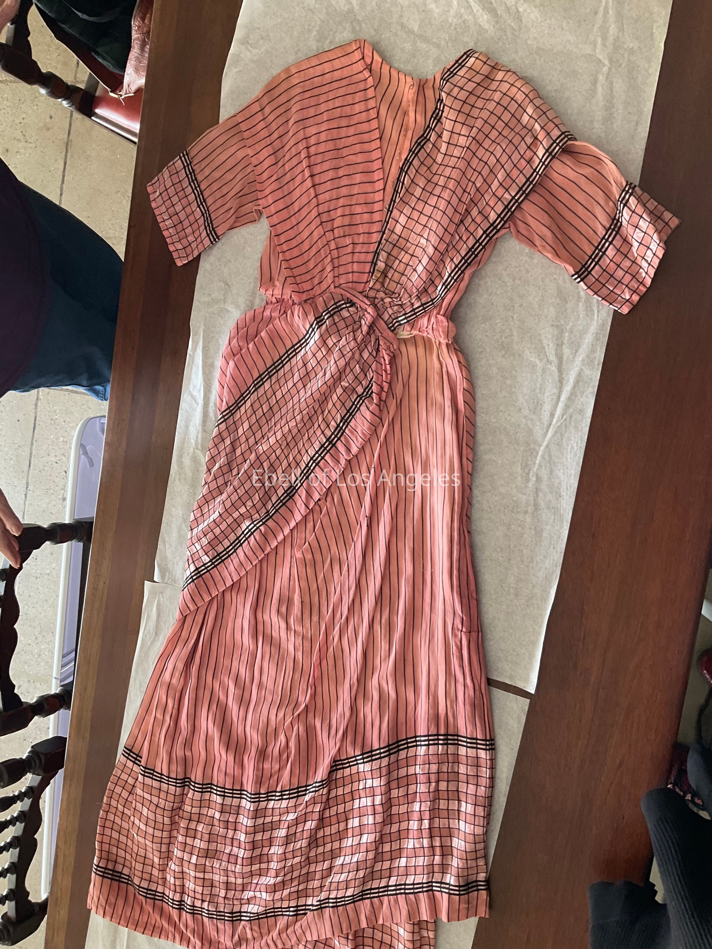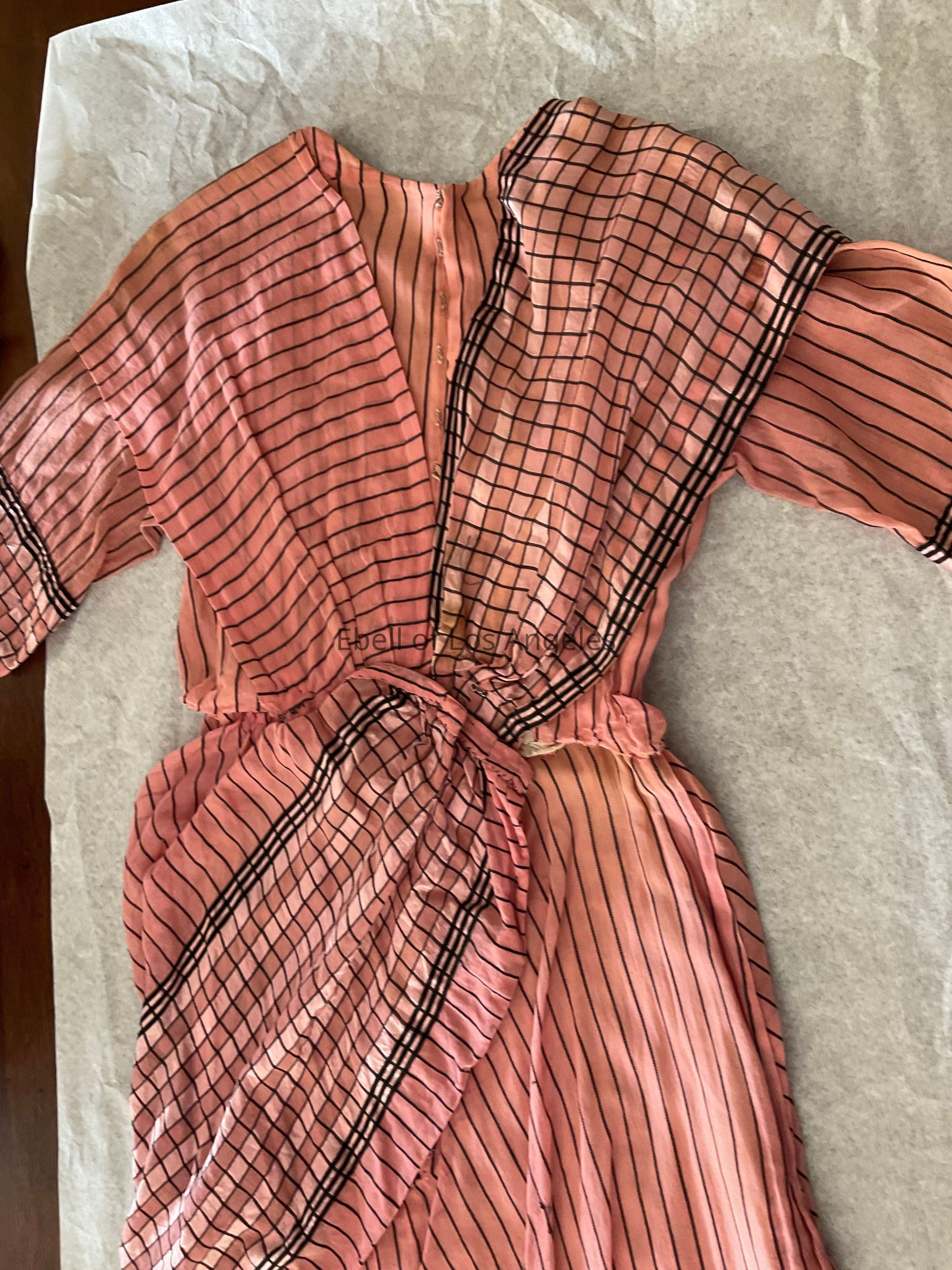 Long striped dress with short sleeves, asymetrical overskirt and shawl collar, checked border