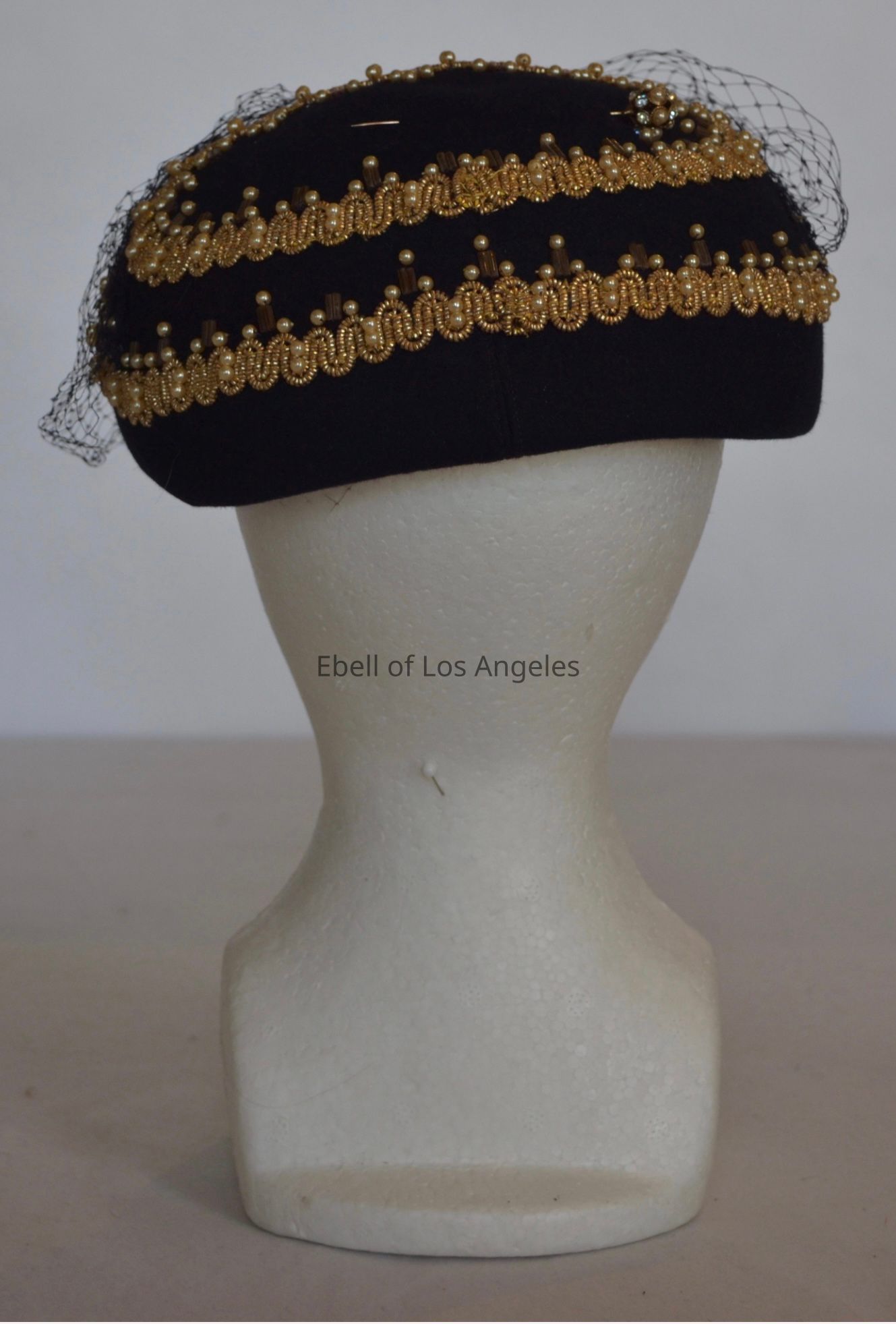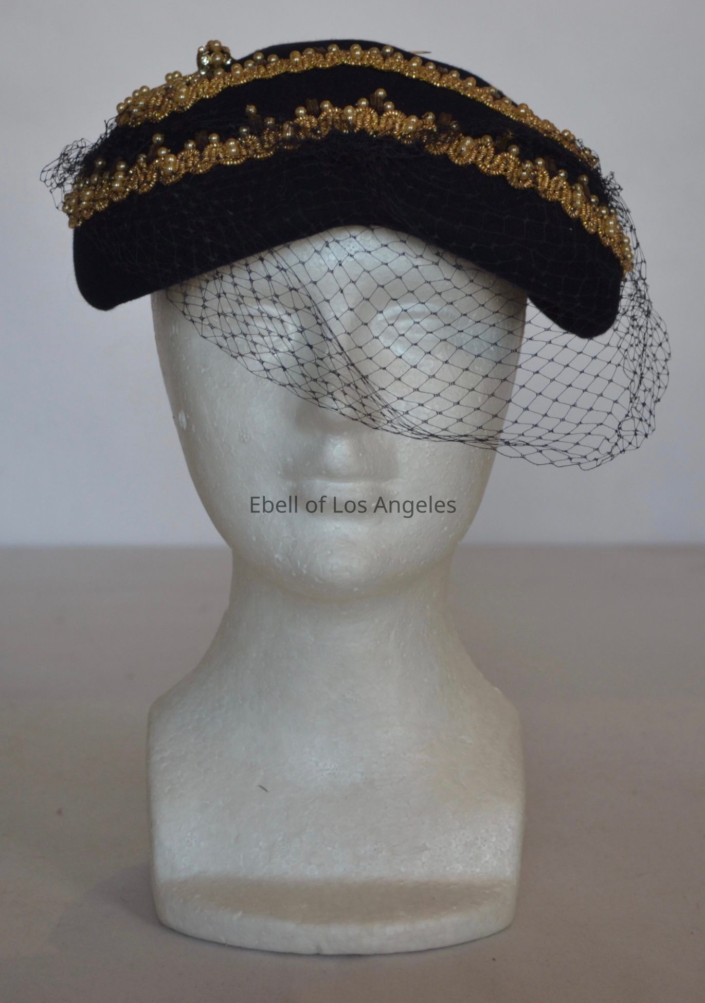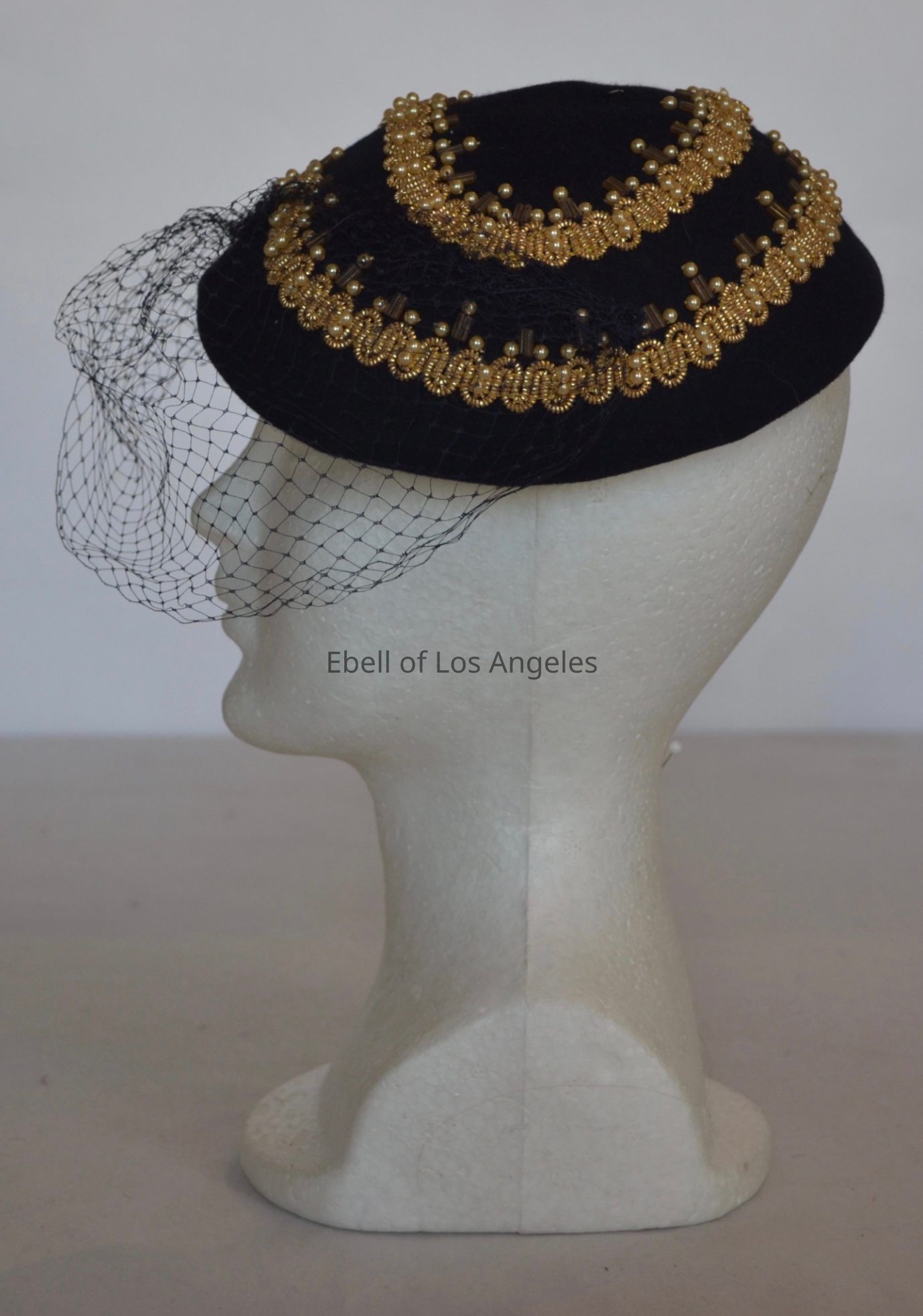 Navy cocktail hat with gold braid trim, tiny gold pearls and Russian veilingCollection