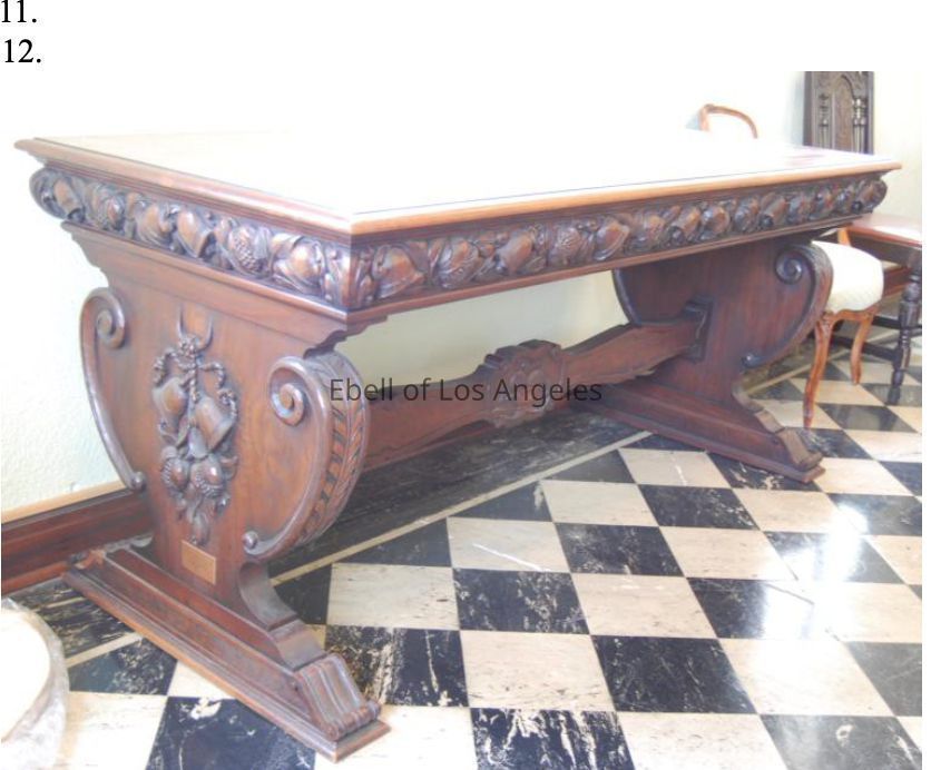 Heavily carved walnut Italian Baroque style library table with urn shaped legs and carved stretcher. Carving on apron and legs features bells and leaves.Collection