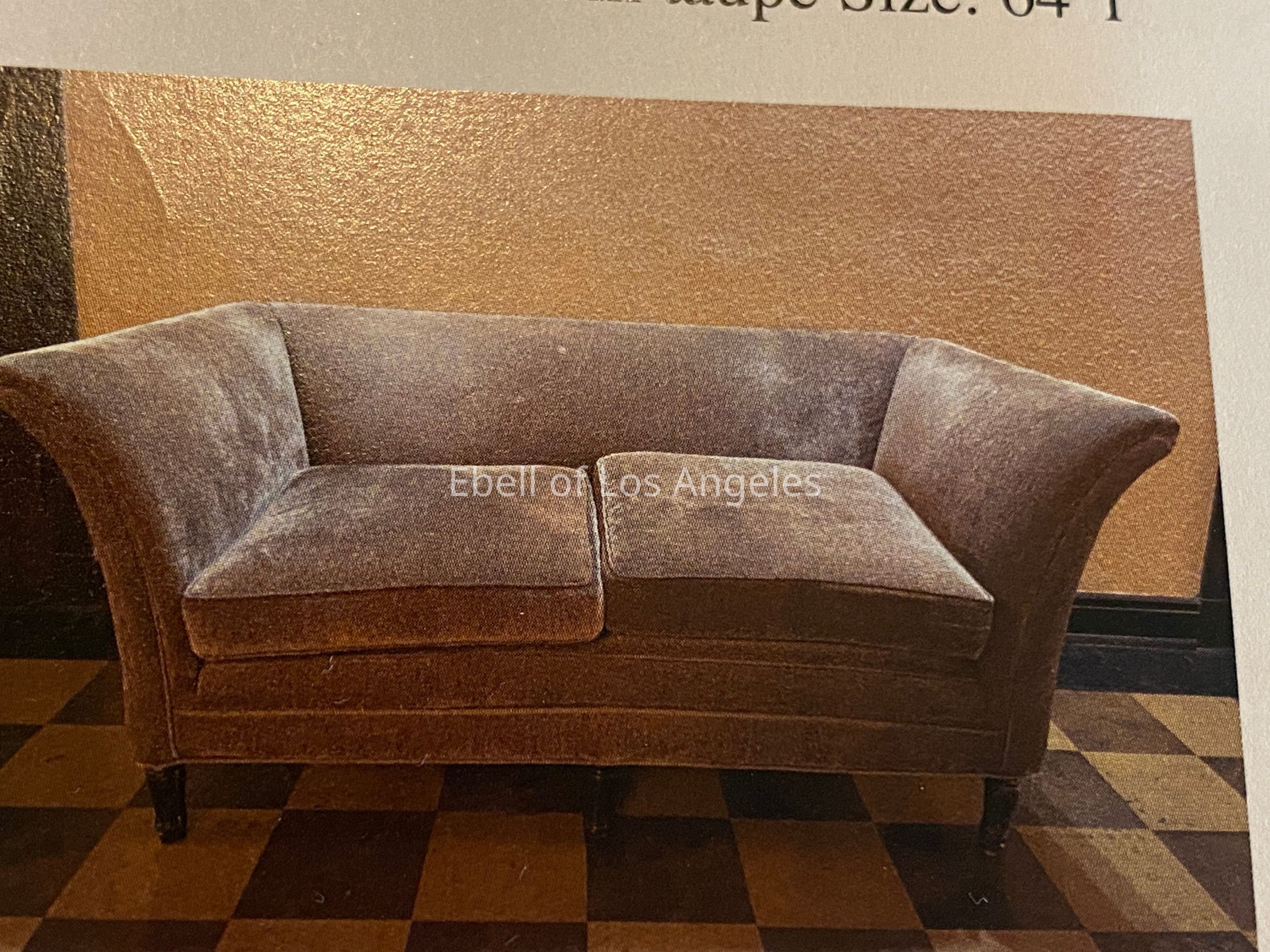 Small two seat sofa with fitted back, flared arms and two loose seat cushions upholstered in taupe velvet with wood legs.