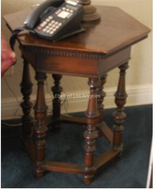 Six sided walnut occasional table with dental moulding on top edge, six turned legs linked at base with plain stretchers.Collection