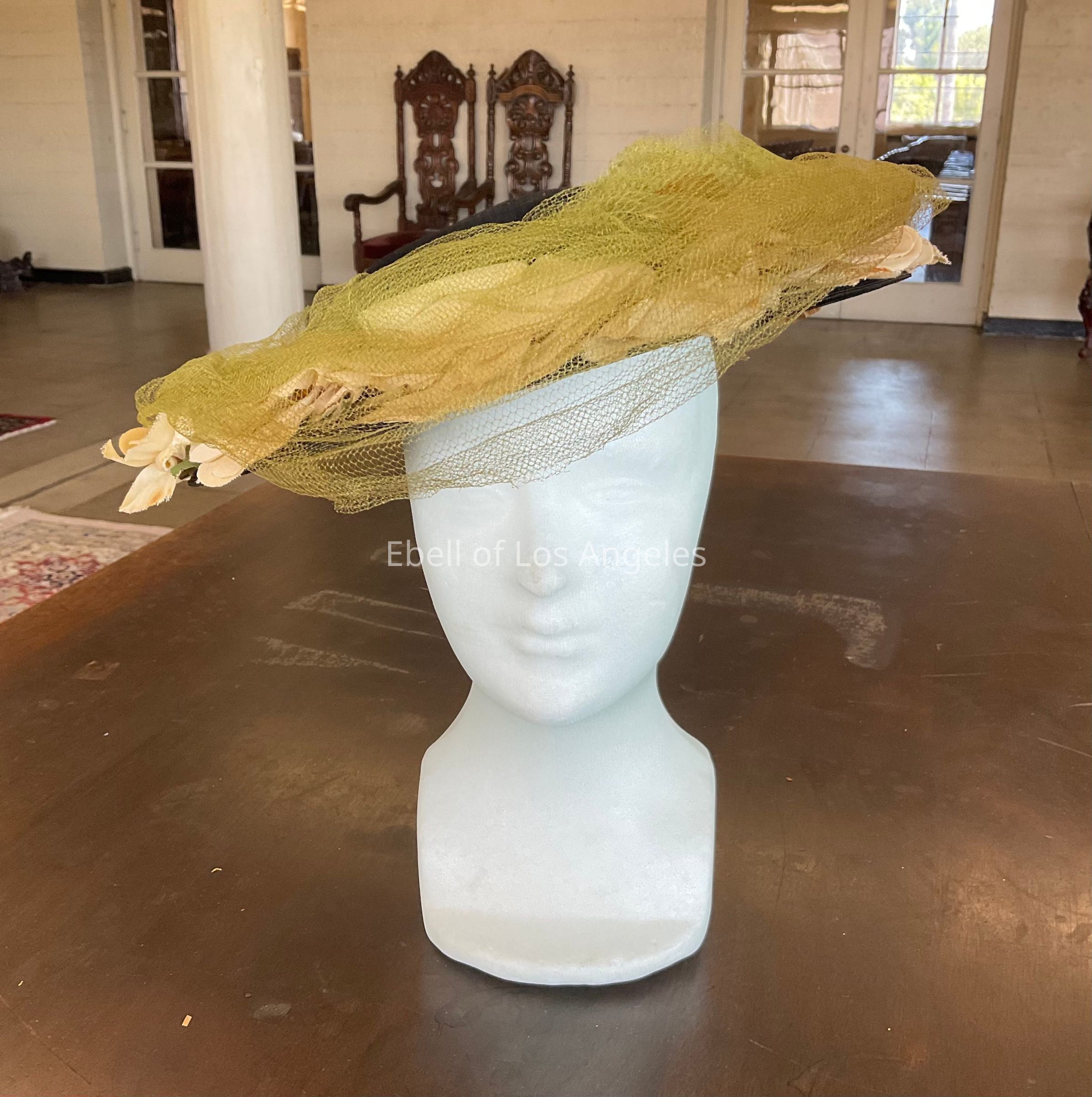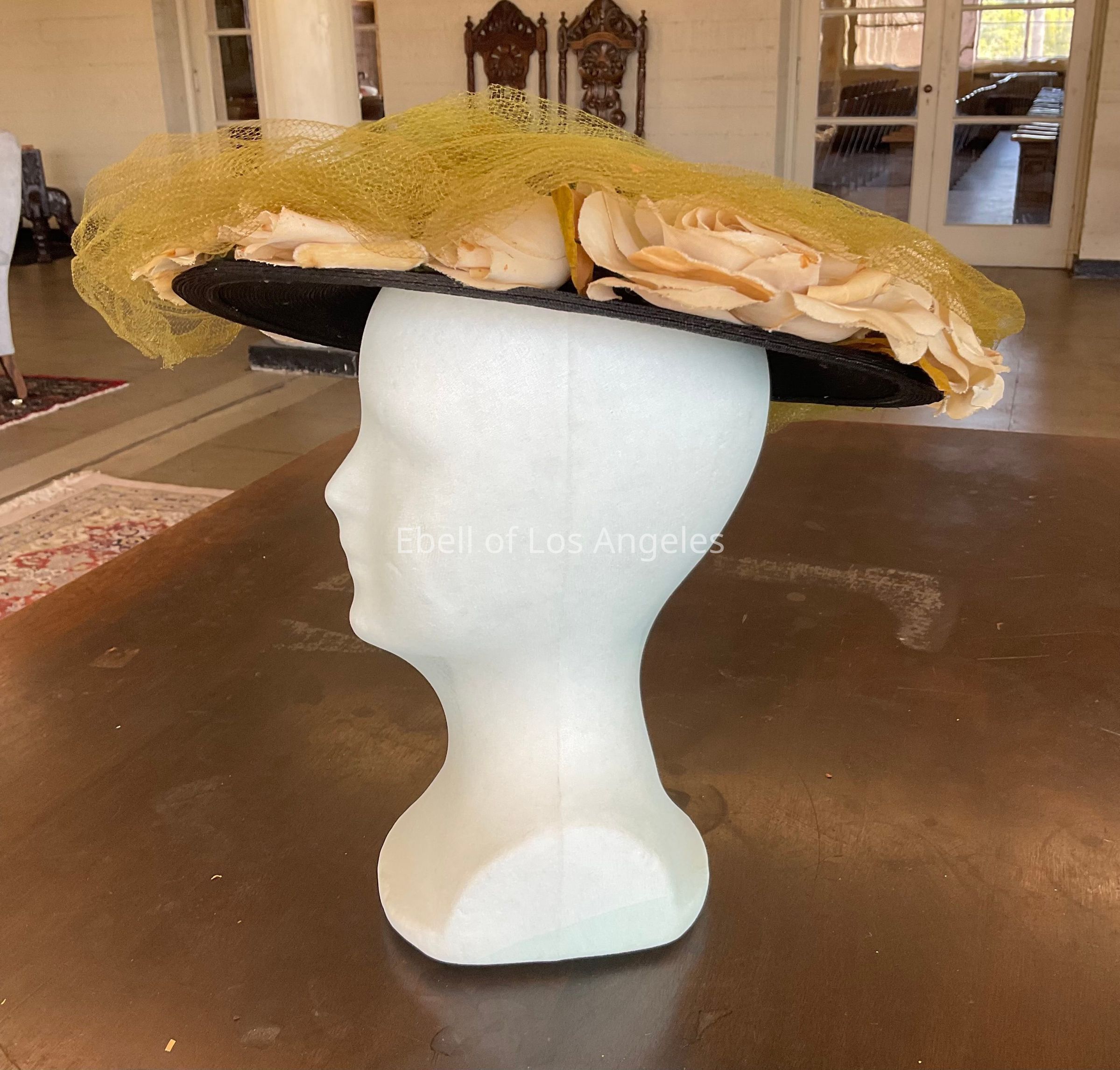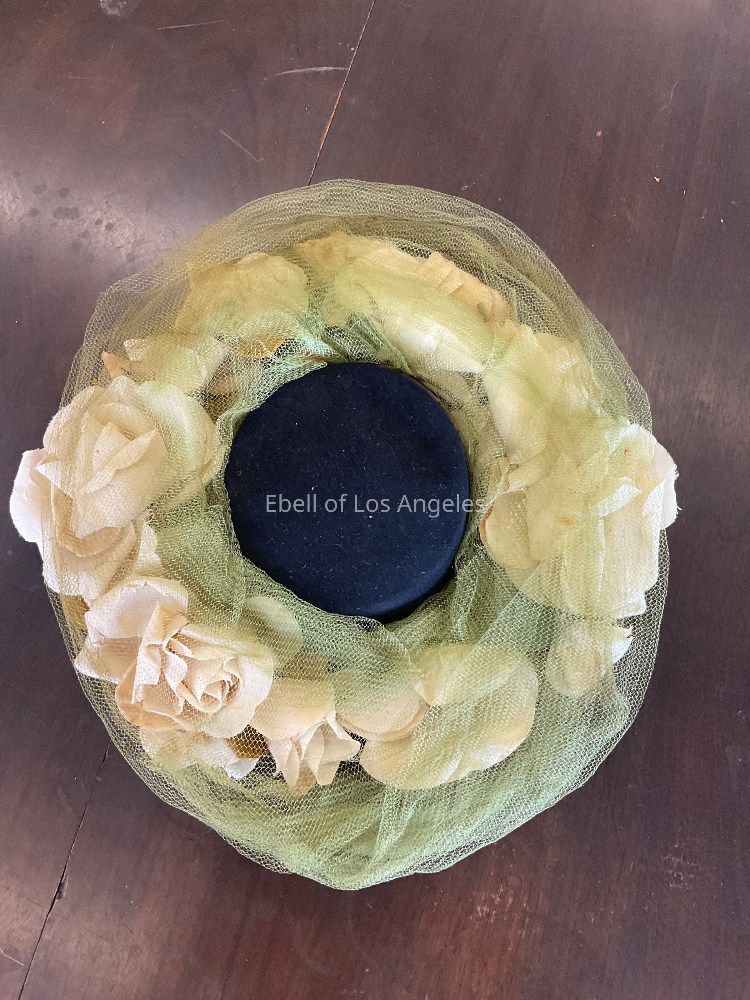 Felt crown and straw brim hat with white roses on brim covered with tulle