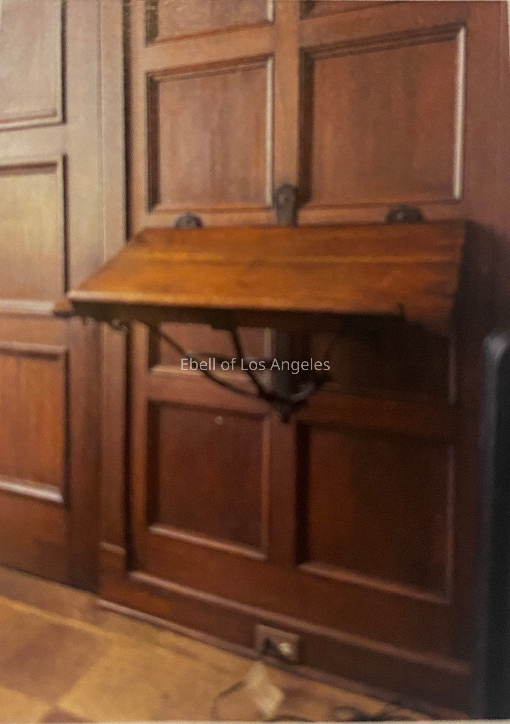 A pair of wooden book display shelves with wrought iron base. These shelves are attached to the walls.