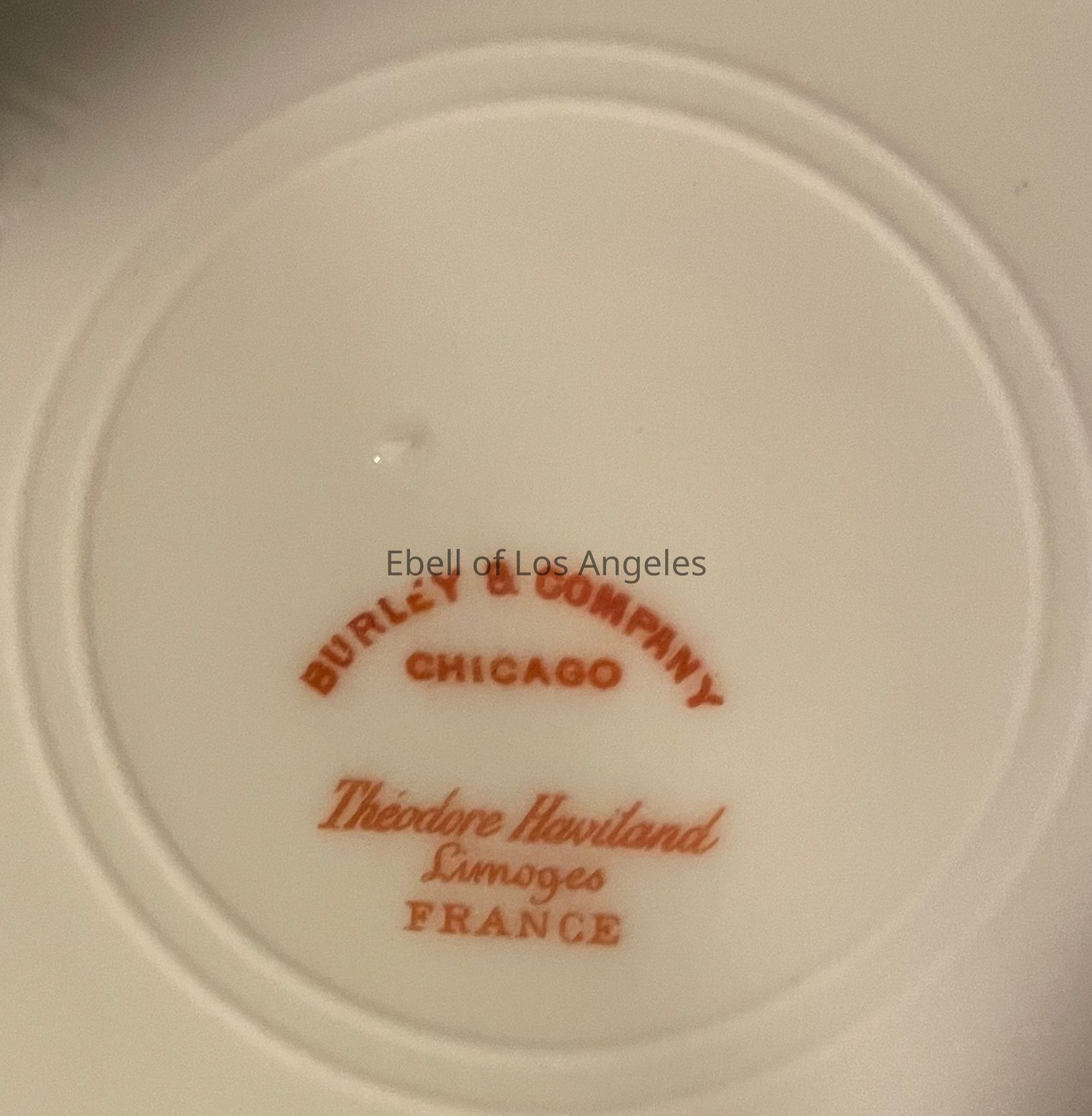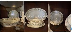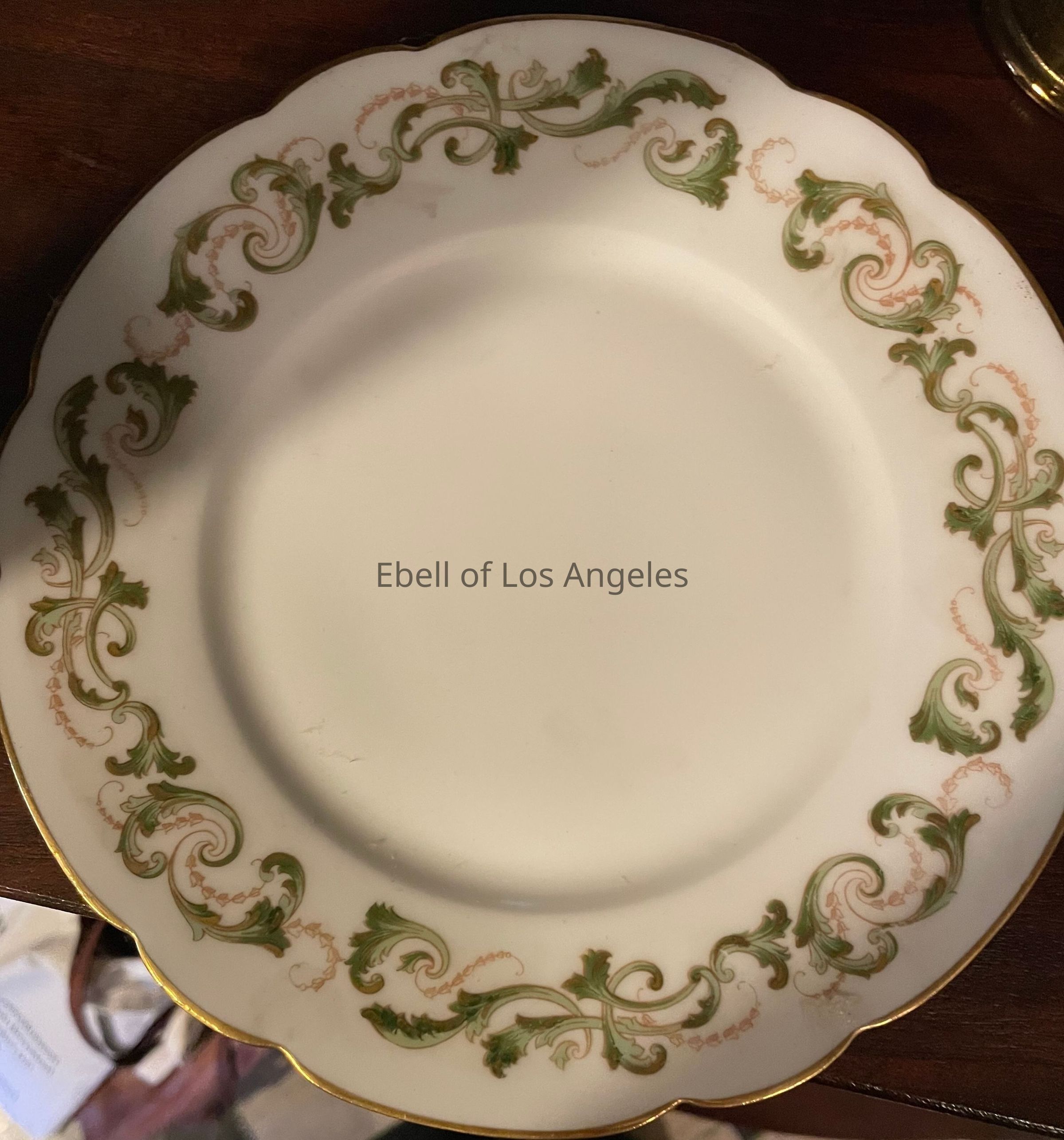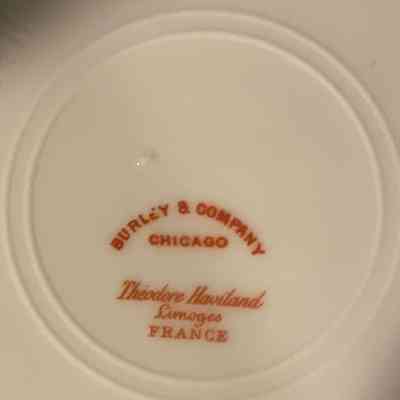 5 piece set of porcelain Theodore Haviland, Limoges. [not Royal Doulton.] White ground with green leaf pattern - serving bowl, serving platter, 2 dessert plates, 1 gravy boat (covered serving bowl with base)
