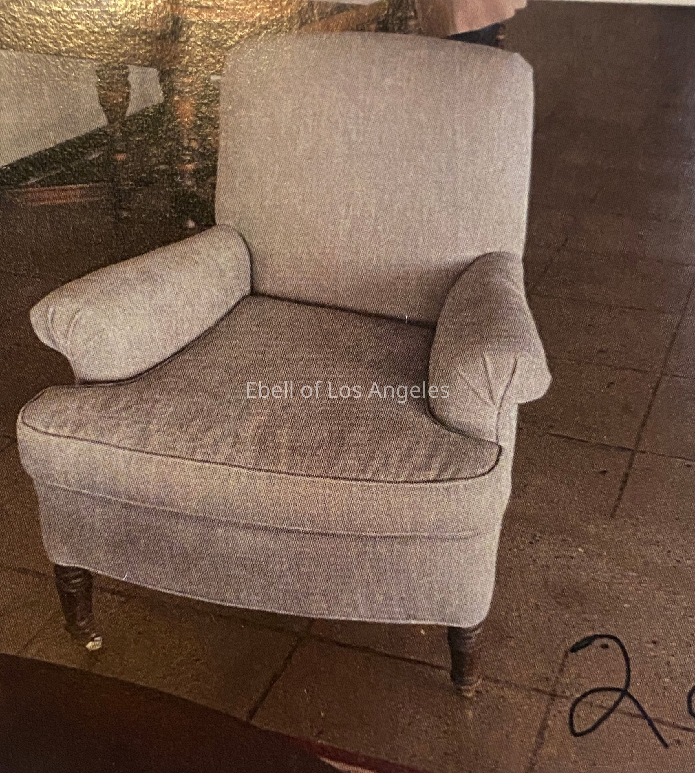 Pair of high back rolled arm chairs with wood feet on casters. The fitted backs and loose cushions are upholstered in a textured gray fabric.