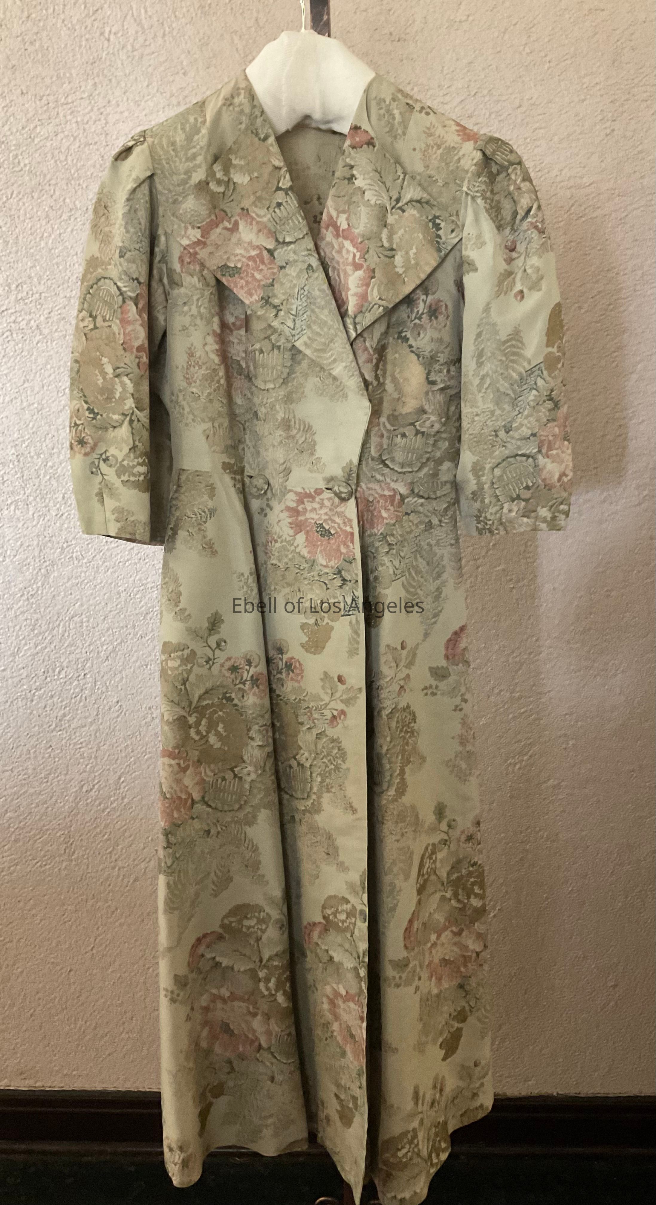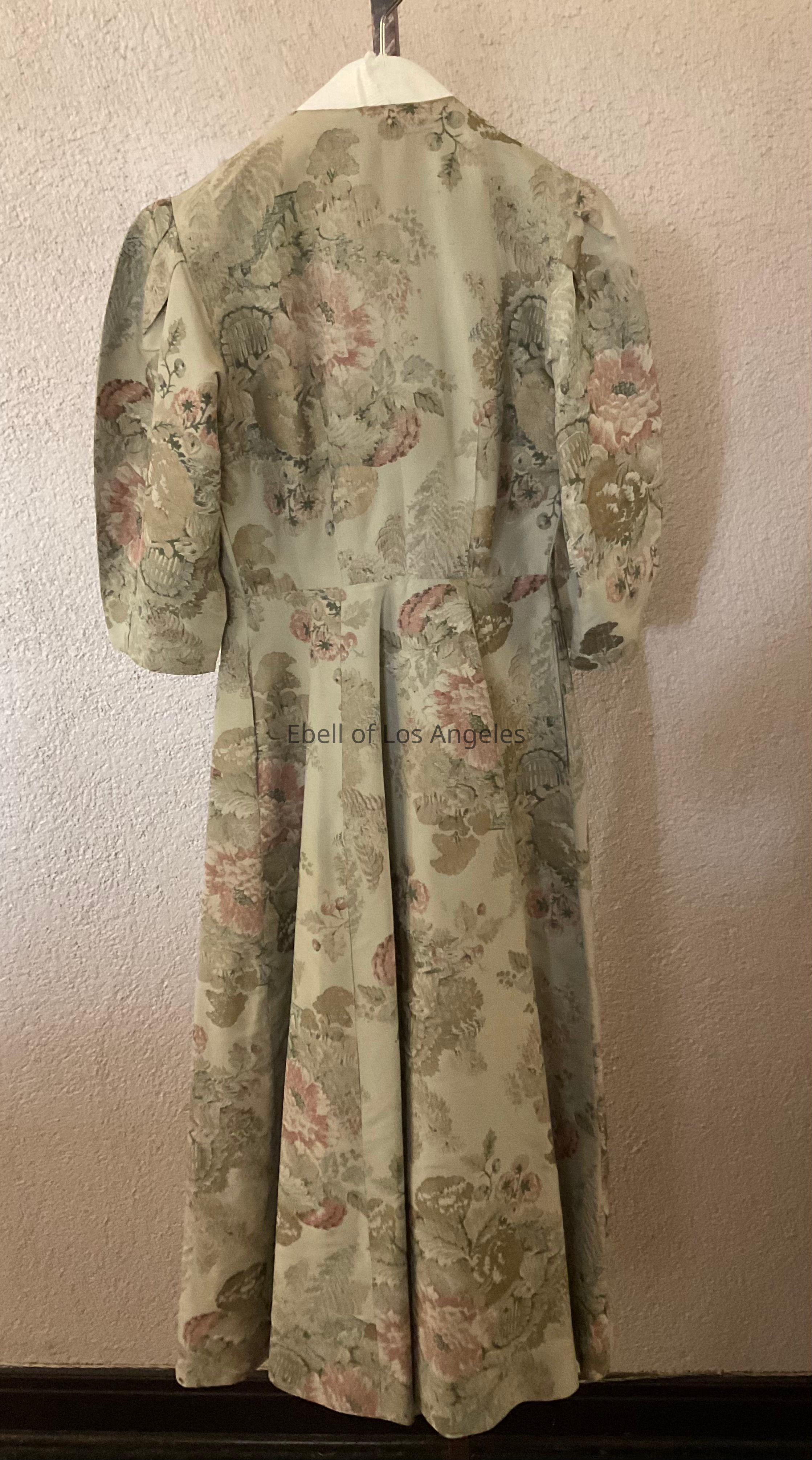 Floral brocade double breasted coat dress with 3/4 sleeves and collar, fitted waist