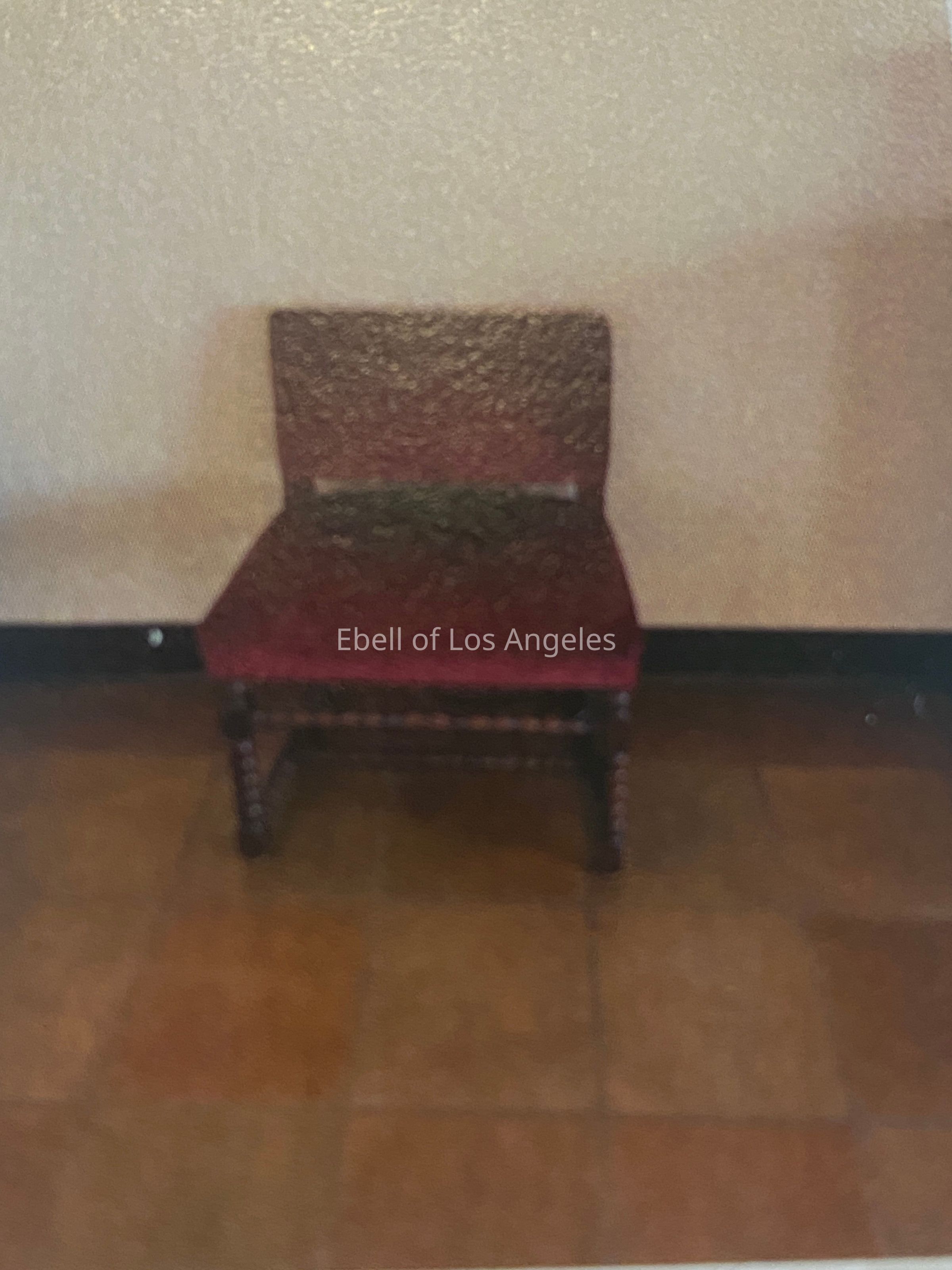 Set of four armless accent chairs with heavily turned spindle legs and stretchers. Fitted upholstery is dark red.