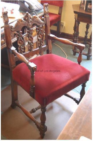 Renaissance style carved walnut armchair. The back has floral and leaf carvings with the arms, legs and stretcher bar are all turned with light carving. The fitted seats are upholstered in red velvet.Collection